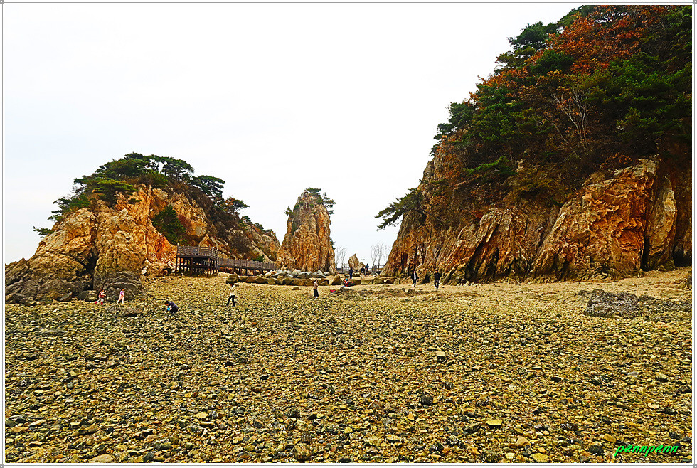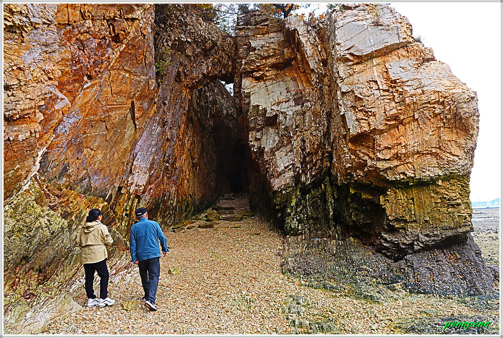 만조(밀물) 때는 용천굴로 가는 바닷길이 물이 잠긴다고 하는 데 우리가 방문한 시각은 오후 2시 경 간조(썰물) 때여서 안심하고 아름다운 해식바위군을 감상할 수 있었습니다. 해식바위(海蝕岩)는 바닷물의 침식 작용으로 인해 형성된 바위를 말합니다. 파도, 조류(潮流), 염분, 바람 등의 작용이 오랜 시간 동안 해안 절벽이나 암석을 깎아내면서 독특한 형태의 바위가 만들어지며 절벽, 동굴, 아취, 기둥 등 여러 형태로 구분됩니다.