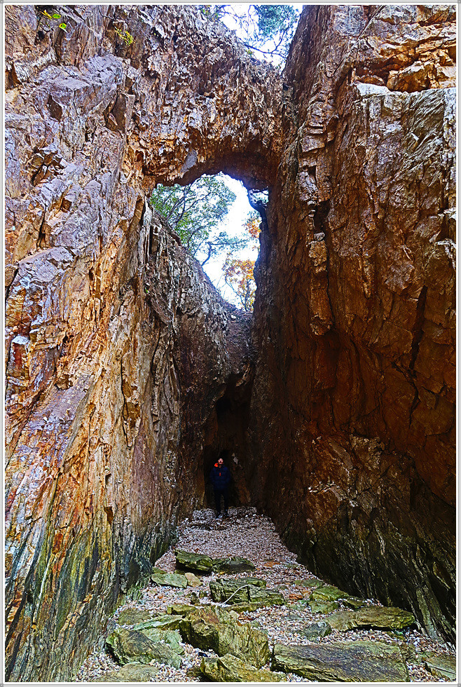 일단 계단을 내려서서 노적봉과 촛대바위 사이로 진입합니다. 데크로드는 촛대바위를 돌아 용천굴을 멀리서 바라볼 수 있도록 조성되어 있군요. 노적봉의 끝자락에 있는 용천굴로 갑니다. 동굴 안쪽에 구멍이 살포시 보이기 시작하네요. 동굴 입구에 서니 용이 하늘로 승천했다는 용천굴이 올려다 보입니다. 다만 스토리텔링은 참으로 신비로운데 동굴 내에서는 명암의 차이가 커서 사진을 찍기가 어렵군요.