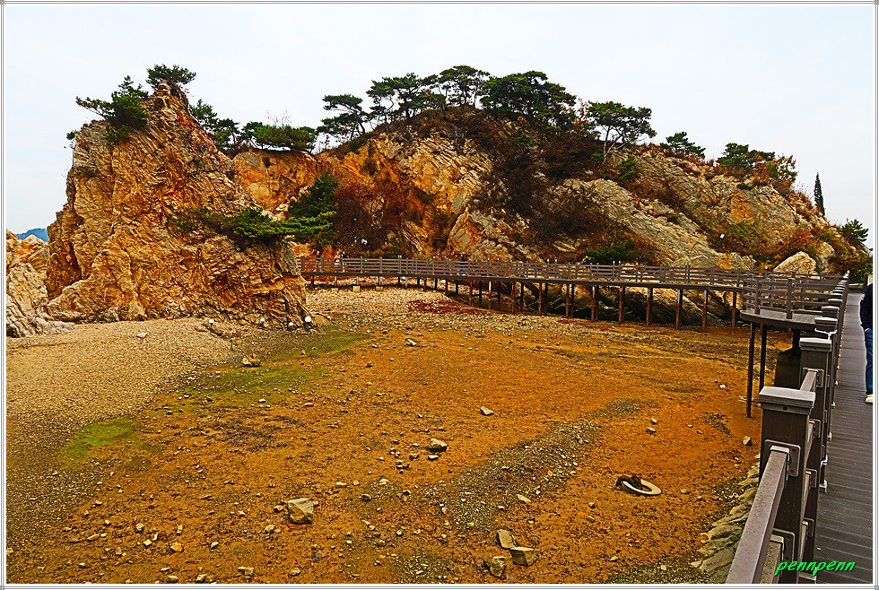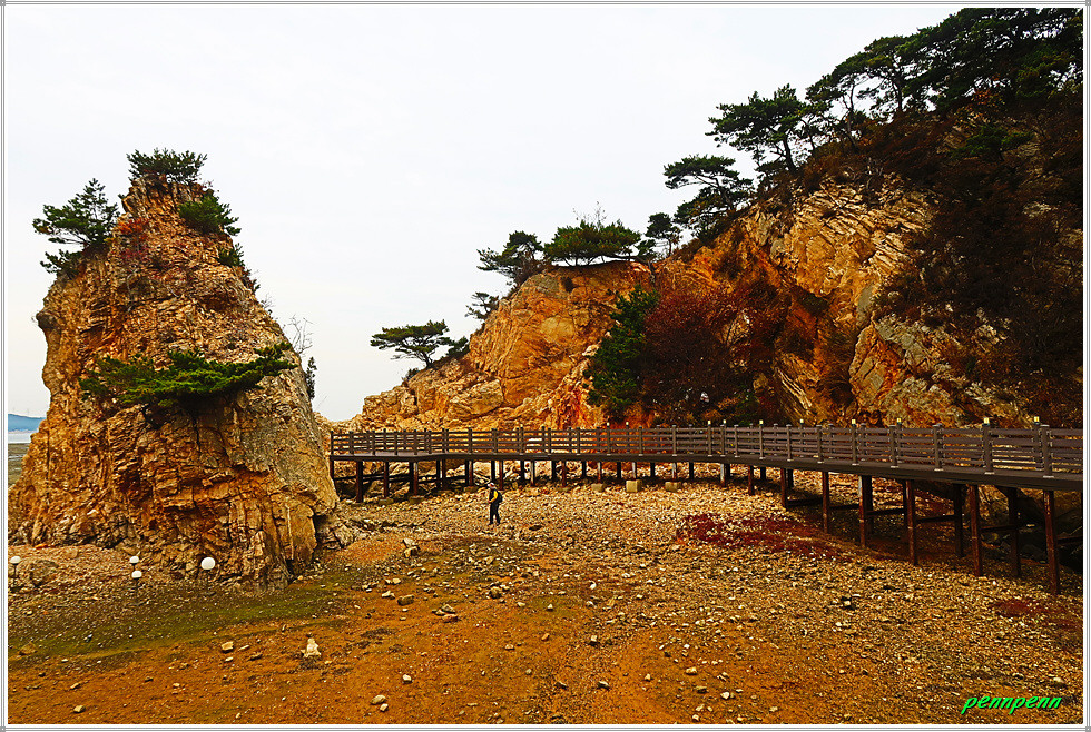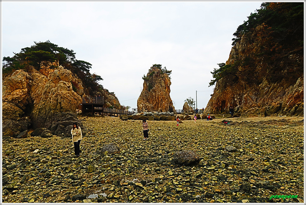 만조(밀물) 때는 용천굴로 가는 바닷길이 물이 잠긴다고 하는 데 우리가 방문한 시각은 오후 2시 경 간조(썰물) 때여서 안심하고 아름다운 해식바위군을 감상할 수 있었습니다. 해식바위(海蝕岩)는 바닷물의 침식 작용으로 인해 형성된 바위를 말합니다. 파도, 조류(潮流), 염분, 바람 등의 작용이 오랜 시간 동안 해안 절벽이나 암석을 깎아내면서 독특한 형태의 바위가 만들어지며 절벽, 동굴, 아취, 기둥 등 여러 형태로 구분됩니다.
