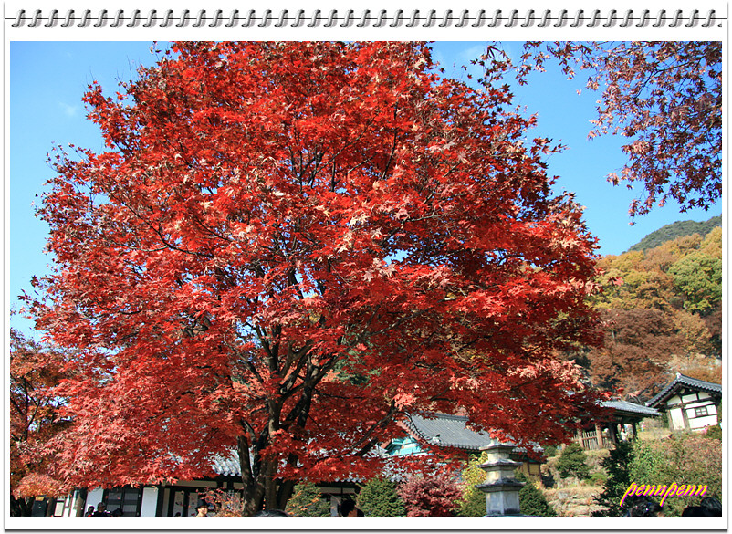 일주문과 천왕문을 지나자 안양루(安養樓)가 올려다 보입니다. 비교적 넓은 뜰에는 한 그루의 아름다운 단풍나무가 자신의 존재를 알리고 있습니다. 사람의 키만큼 튼실한 삼각대와 배낭처럼 생긴 카메라 전용가방을 맨 한 무리의 사람들이 열심히 이 모습을 촬영하고 있습니다.