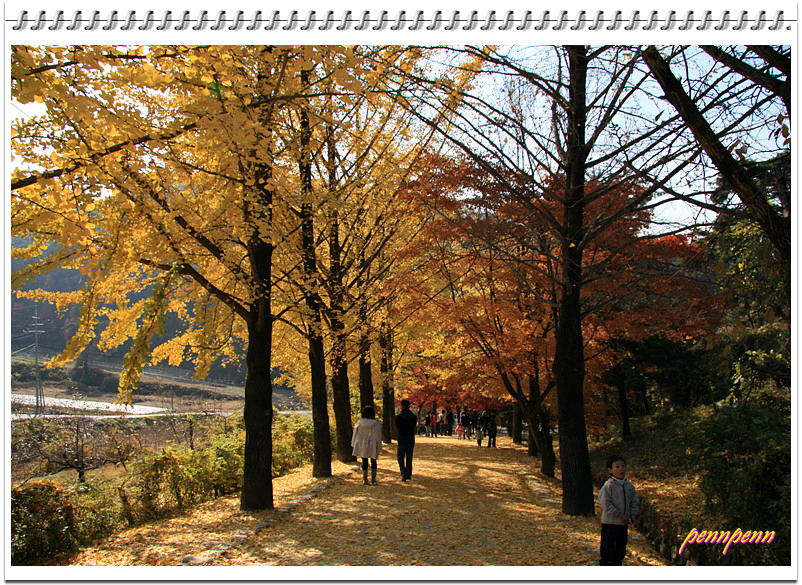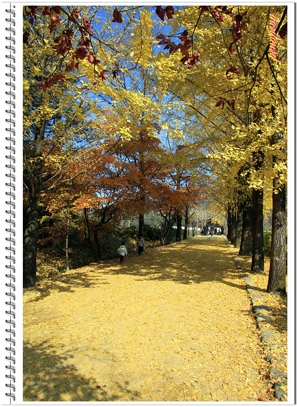 매표소를 지나자 길 양쪽으로 가지런하게 선 은행나무가 반겨줍니다. 나뭇가지에 매달고 있는 은행잎보다는 땅위에 내려놓은 잎이 더 많은 듯 합니다. 어른의 손을 잡고 나들이를 나온 어린이도 손짓 발짓으로 노란 잎을 가리킵니다. 이 순간 카메라를 든 어른들은 자녀들의 귀여운 모습을 담느라고 모두가 진지한 사진사가 됩니다.