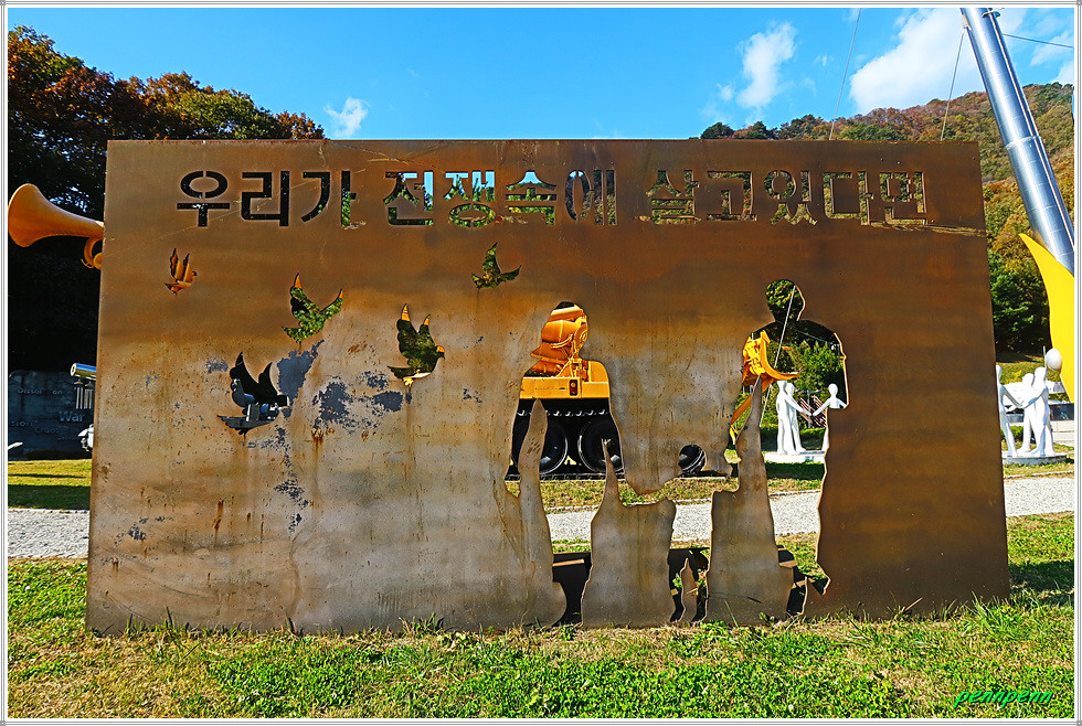 “대화의 나팔”은 전쟁은 곧 상대방과 대화를 거절한다는 것으로 너와 내가 평화롭기 위해서는 서로를 받아들이는 마음으로 대화의 문을 열어야하며, 귀를 기우려보면 평화의 메시지가 들릴 것입니다. “손에 손잡고”는 커다란 평화마크 위에 군데군데 배치한 사람모양 청동인형을 연출하여 관람객이 인형의 손을 잡으면 둥근 모양의 평화의 심벌이 완성됩니다. 너와 내가 등지지 않고 서로를 바라보며 서로를 아껴주는 행복한 세상을 만들자는 의미가 담겨 있습니다.