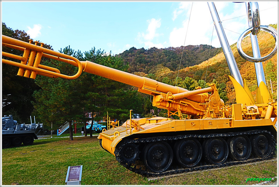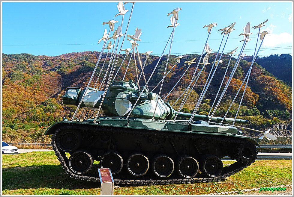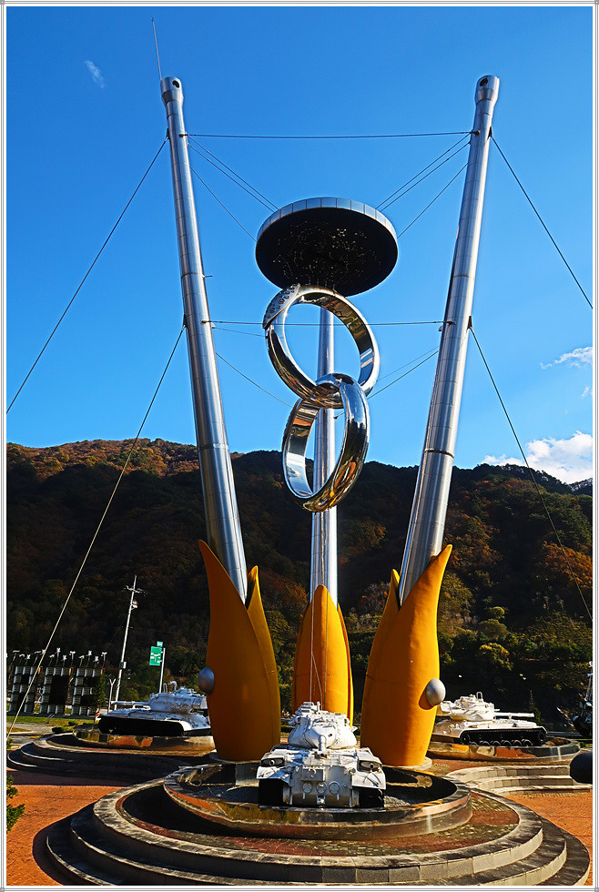 규모가 큰 주차장에는 국제평화아트파크를 알리는 입체글씨가 세워져 있는데 전망대에서 내려다보면 아트파크를 대표하는 조형물인 “평화의 약속”이 공원(파크) 중심부에 우뚝 서 있습니다. “3개의 포신은 자유와 평화 및 사랑을, 천상의 별자리는 아름다운 세상을, 두 개의 반지는 다음 세대와 영원한 평화의 약속을, 기둥아래 장식은 자라나는 평화의 새싹을, 흰색탱크는 평화수호자로서의 역할을 상징합니다.”