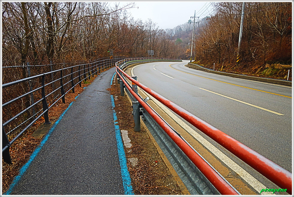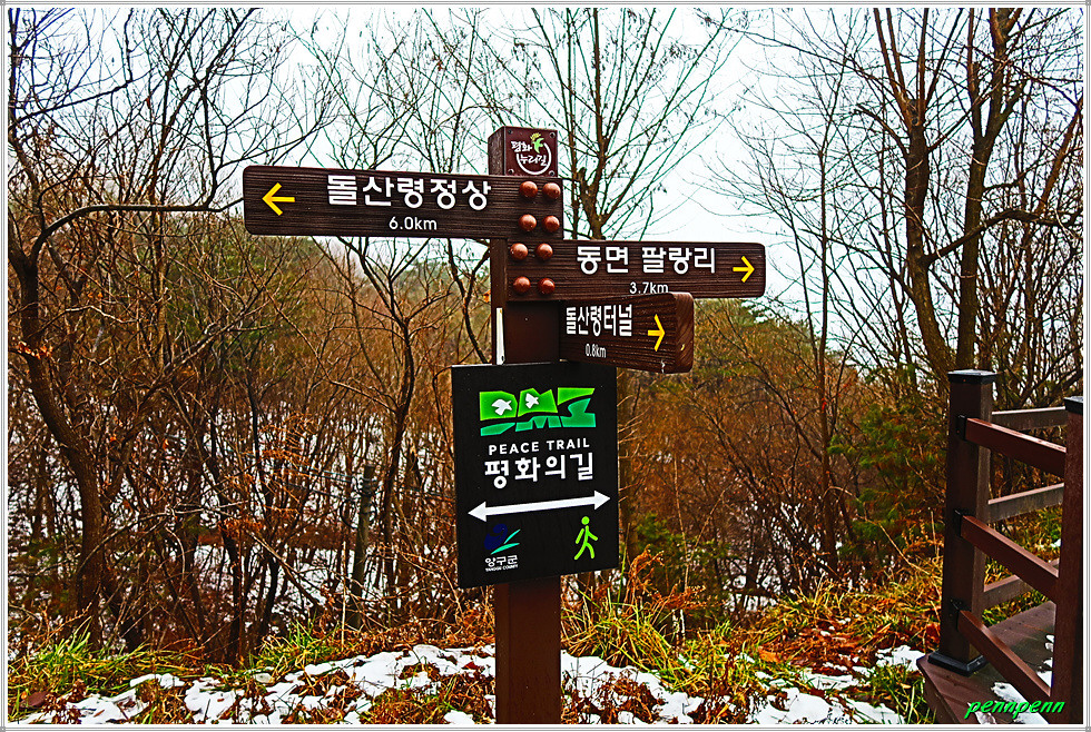 그런데 이곳에서 목적지인 DMZ자생식물원해안입구까지의 거리는 17km이지만 해발고도 1,050m에 달하는 돌산령 정상을 넘는 게 만만치 않아 체력이 달려 부득이 단조로운 길 약 4.5km를 단축해 돌산령 터널로 진입하기 전 삼거리인 “대암산 용늪가는 길 입구”방향에서 출발합니다. 여기서 453번 지방도로(펀치볼로)를 따라 계속가면 돌산령터널로 이어지지만 평화의 길은 우측 구절양장 같은 돌산령 옛길(도로)로 진입해야합니다. 이곳에서 대암산 용늪 가는 길 입구까지의 거리는 1.3km이며, 여기서부터 돌산령을 거쳐 돌산령터널출구 합류점까지는 혹한기 폭설 및 결빙에 대비하여 일반 차량의 통행을 금지하고 있어 우리는 차도를 전세내어 걷습니다.