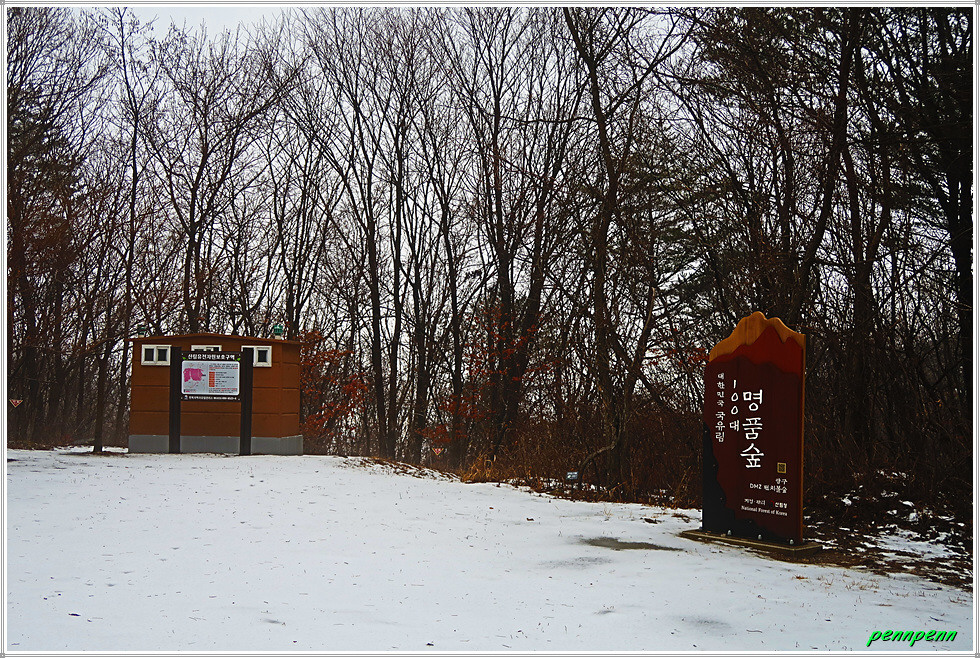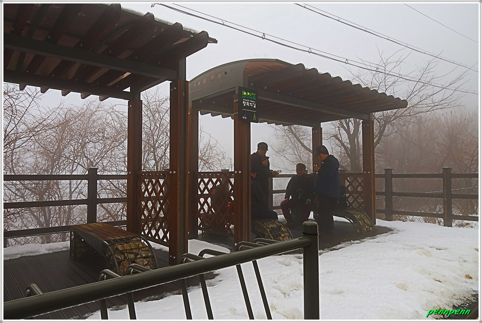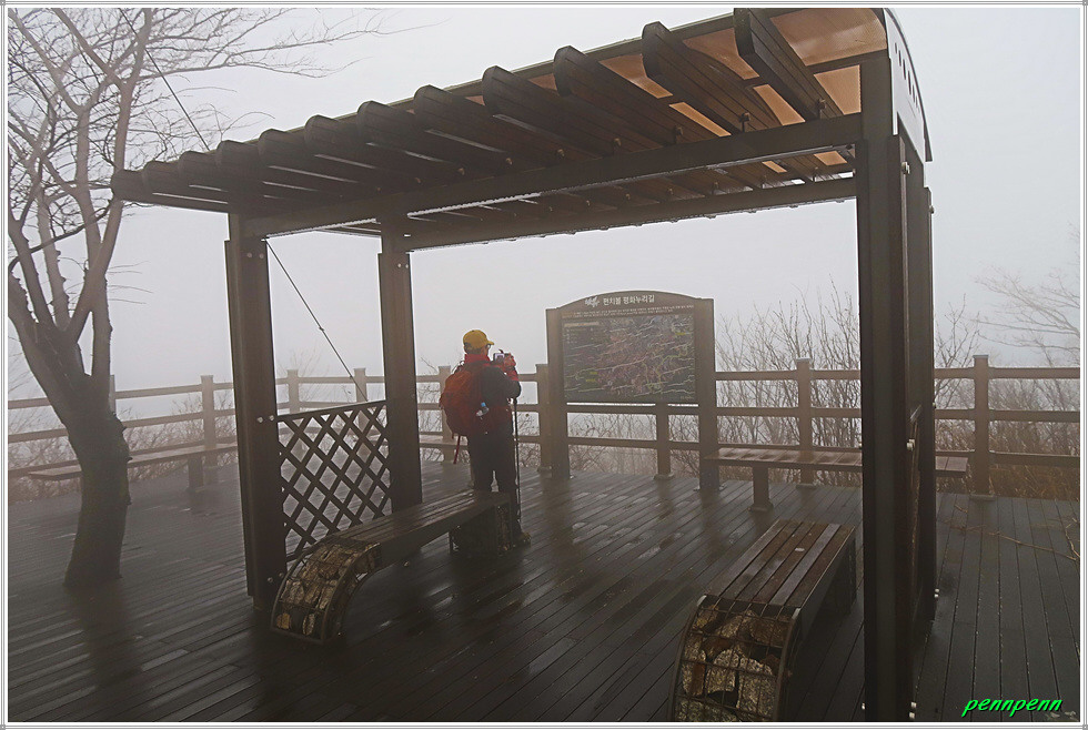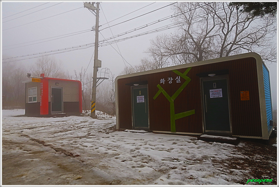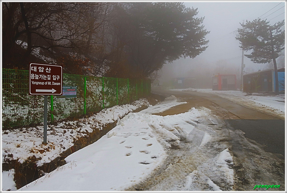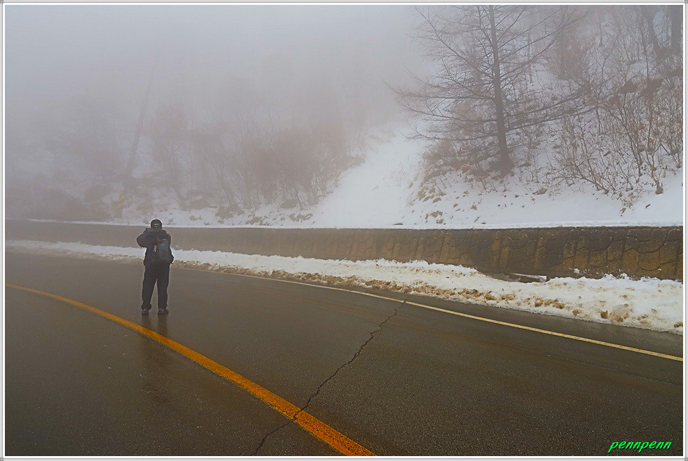필자는 2년 전 강원도 평화누리길을 걸으며 이 코스를 답사하였기에 이번에는 복습하는 셈입니다. 평화누리길의 이정표는 낯이 익군요. 도로변 쉼터에서 일행을 만나 간식을 먹습니다. 안개가 얼마나 짙은지 30m만 떨어져도 전혀 앞사람이 보이지 않을 지경입니다. 차도는 제설작업이 되어 있어 걷기 편하지만 도로를 벗어난 지역은 그간 내린 눈이 쌓여 설국으로 변해 있습니다.