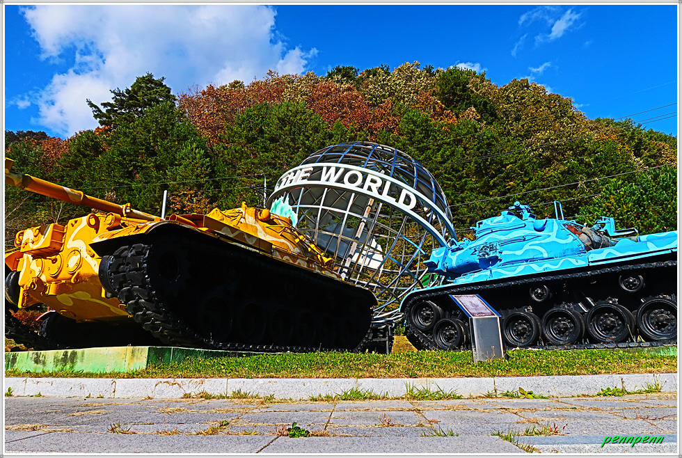 우측 언덕에는 원형의 지구본과 탱크가 어우러진 작품이 있는데 바로 “One For All”(세상이 나에게, 내가 세상에)입니다. 평화를 위해 우리는 모두 하나라는 간절한 메시지를 표현한 작품으로서 모두가 힘을 합하여 지구를 떠받드는 형태로 평화의 땅 화천으로부터 전 세계에 평화의 기운이 뻗어 나가기를 바라는 마음을 형상화한 것이며, 다섯 대의 다른 색의 탱크는 오대륙을 상징하고, 지구본은 자유를 사랑하는 지구인들을 표현합니다.