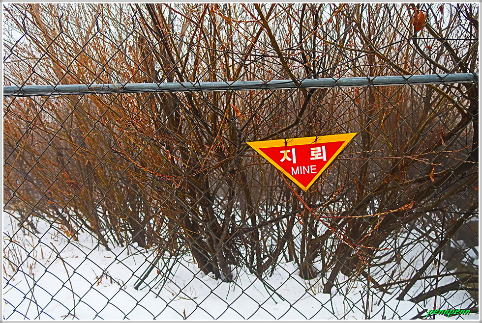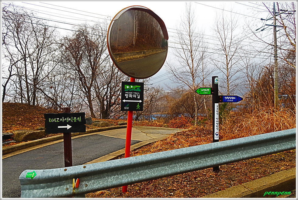 도로는 민간인들의 통행이 허용되지만 도로를 벗어난 지역은 민통선(민간인출입통제지역)이어서 함부로 출입하여서는 아니 되며, 특히 지뢰가 묻혀 있을 수가 있다는 경고의 표지가 자주 보입니다. 또한 이곳은 산양의 주요 서식지라는군요. 지나는 길목에는 DMZ 야생화벨트 조성사업을 알리는 안내문이 있지만 겨울철이어서 야생화를 볼 수 없음이 아쉽습니다.