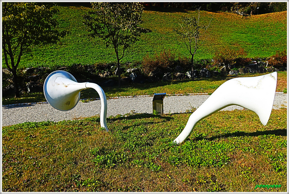 “DMZ”라는 작품에도 국제평화아트파크 글씨를 붙여 놓았군요. 우리나라는 전 세계 유일의 분단국으로서 이 작품은 155마일 휴전선 일부를 그대로 재현한 것입니다. DMZ의 역사성과 상징성을 표현하며 색색의 기원을 담은 리본들이 철조망에 있는 한 평화는 지속될 것입니다. 철조망 뒷면의 작품은 “평화의 함성”입니다. 냉전과 대립의 상징물인 대북방송장비를 조각이 보여주는 형태적인 안전감을 통해 평화라는 문자의 메시지를 직접적으로 전달하는 조형물입니다.