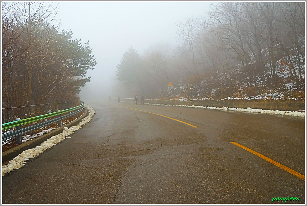 오늘 12.5km를 걷는데 3시간 40분이 소요되었습니다. 그런데 걷기를 시작할 때부터 마칠 때까지 짙은 안개로 인해 아무런 조망도 하지 못했고 가장 하이라이트인 펀치볼의 모습을 볼 수 없었음은 유감입니다. 또한 돌산령을 하산하는 코스의 차도는 제설작업이 전혀 안되어 미끄러운 길을 걷느라 크게 고생했습니다.