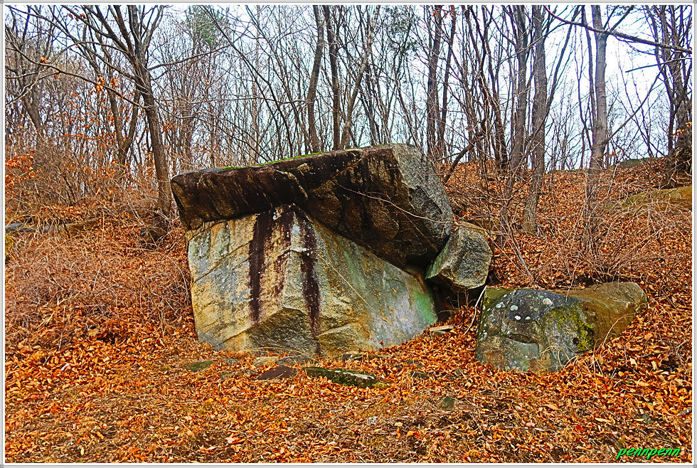 여기서 DMZ 자생식물원까지는 우측으로 250m입니다. 국립DMZ자생식물원 입구에는 펀치볼 둘레길과 오유밭길 안내도, 그리고 학사모바위가 있는데 학사모바위는 바위의 생긴 모습이 대학의 졸업식(학위수여식)에서 주는 학사모를 닮아 자녀를 도회지로 유학을 보낸 학부모들이 정안수를 떠 놓고 대학합격을 기원하던 바위랍니다. 이곳 평화의 길 이정목에 DMZ평화의 길 28코스 QR인증코드가 있습니다.