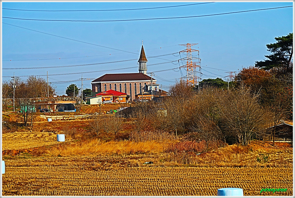 82코스의 출발지는 당진시 송산면 유곡리 유곡2교차로입니다. 교차로에서 잠시 서쪽으로 가는데 북으로 바라보면 당진엠코타운아파트가 빌딩숲을 이루고 있습니다. 사거리갈림길에서 남쪽으로 방향을 돌립니다. 해링턴플레이어스에듀타운아파트도 고층이로군요. 당진에 이처럼 높은 아파트타운이 있는 줄 미처 몰랐습니다. 맞은편 언덕에는 당진유곡교회가 우뚝하네요.