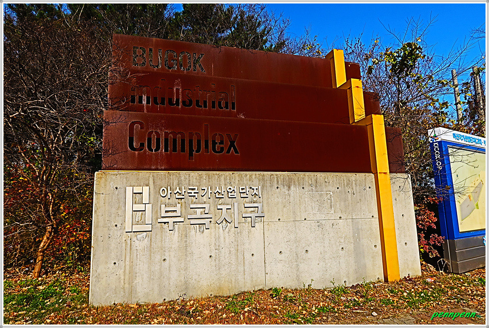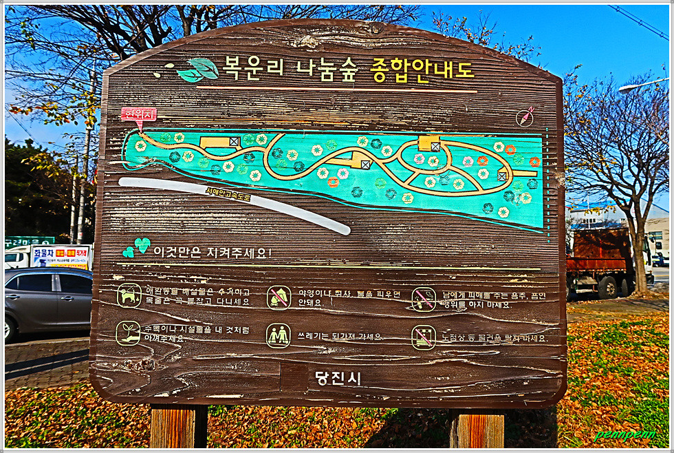 기념관을 둘러보고는 부곡1리마을회관을 지나 남쪽으로 갑니다. 부곡2교를 건너 북부산업로를 따라 가다가 북부산업로를 가로지르는 보행자 전용육교를 건너 계속 남하합니다. 아산국가산업단지 부곡지구 표석 옆에 서해랑길 83코스 지도가 있습니다. 이곳은 바로 복운리나눔숲입니다. 당진시 송악읍 복운리 소재 복운리 나눔숲은 사회·경제적 취약계층이 거주하는 녹지취약지역 생활권 주변에 녹지환경을 개선해 국민 여가활동 및 복지 증진에 기여하는 사업으로 산림청 산하 녹색사업단 공모사업에 선정돼 사업을 추진했습니다. 이곳에는 계수나무, 명자나무 등 수목식재, 산책로 포장, 시설물 설치 등으로 장애 유무, 연령 등에 관계없이 모든 시민들이 이용하기에 불편함이 없는 생활 속 녹색공간을 조성했습니다.