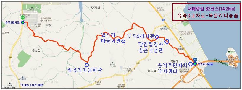 ▲ 코스 : 유곡2교차로-정곡리마을회관-월곡리마을회관-부곡2리마을회관-당진 필경사(심훈기념관)-복운리나눔숲