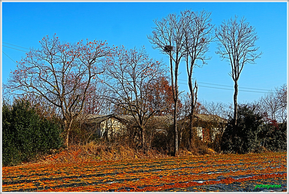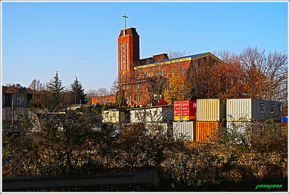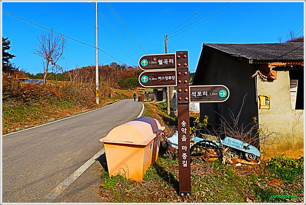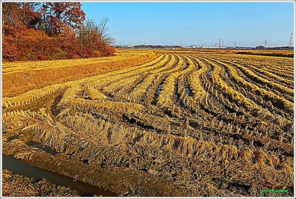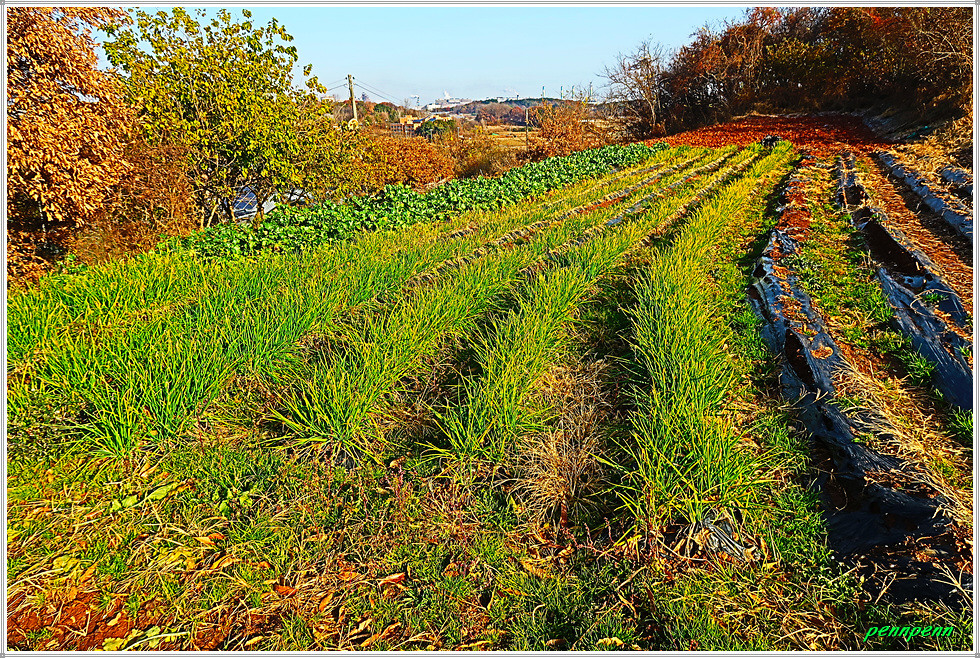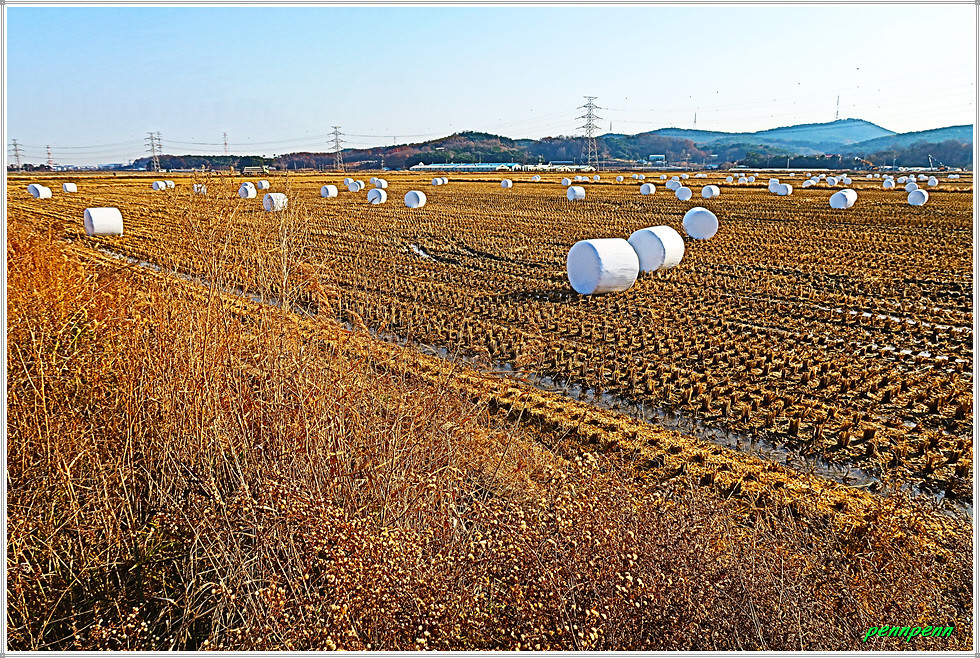 고갯마루에 올라 CU편의점이 있는 곳에서 동남쪽 소로로 진입합니다. 지나가는 길목에는 화사한 단풍이 남아 있군요. 길섶에 공장 건물이 보이는 가운데 녹색의 식물이 반겨줍니다. 농사용 도로처럼 보이는 길은 포장이 되어 있고 자동차 통행도 가능합니다. 가을추수가 끝난 논은 다가올 겨울을 기다리는 모습입니다. 논에는 곤포 사일리지(가축사료용 건초더미)가 많이 놓여 져 있네요.