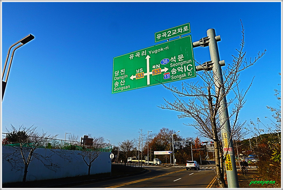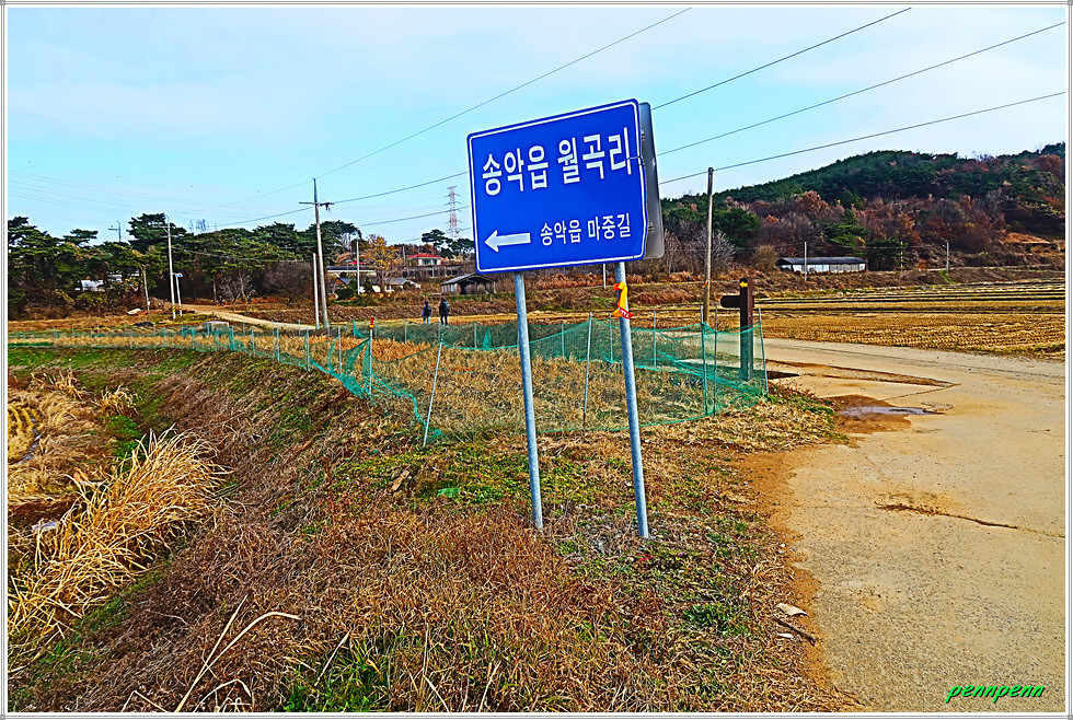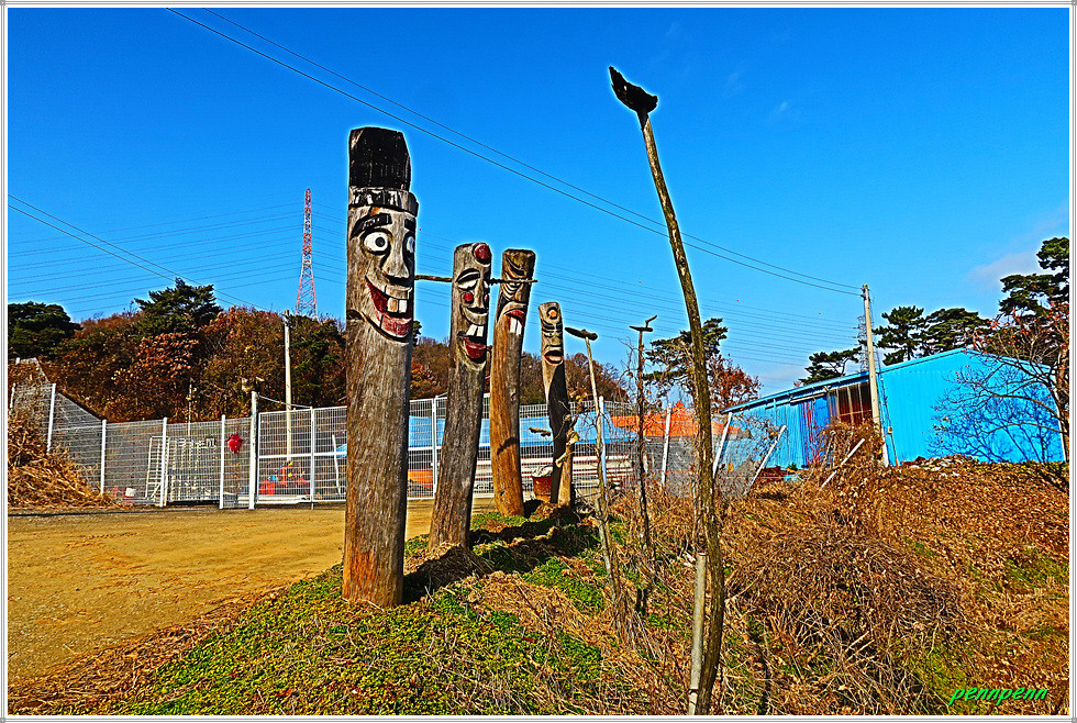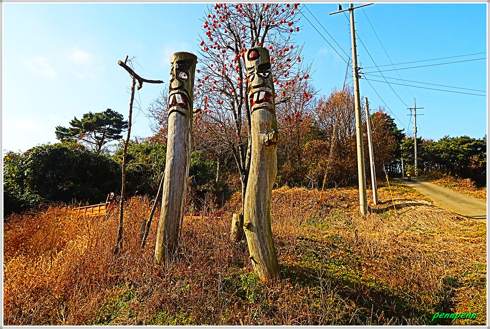 북쪽 해안가에는 현대제철 당진일관제철소가 멀리 바라보입니다. 개천을 가로지르는 다리를 건너가는데 개천에는 무슨 공사가 한창이더군요. 논에는 엄청나게 많은 철새들이 몰려와 아름다운 노래를 들려줍니다. 송악읍 정곡리마을회관을 지나가는데 지금 걷는 이 길은 송악읍 마중길입니다. 작은 고갯마루를 넘으니 주렁주렁 매달인 감나무가 탐스럽습니다. 송악읍 월곡리 길을 지나갑니다. 다시 작은 고갯마루를 넘노라니 여러 기의 장승과 솟대가 길손을 반겨주네요.