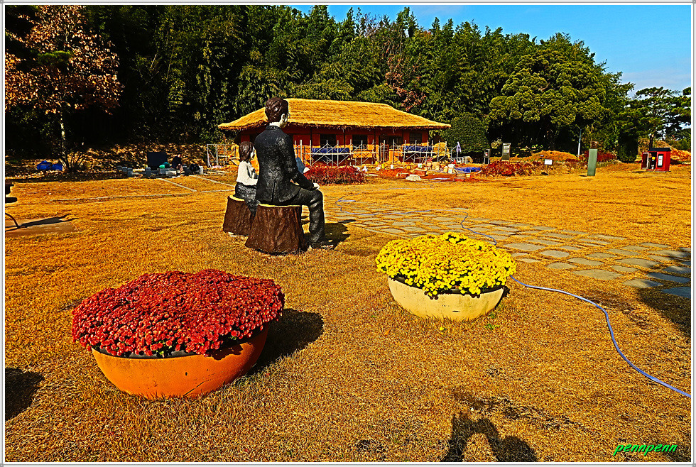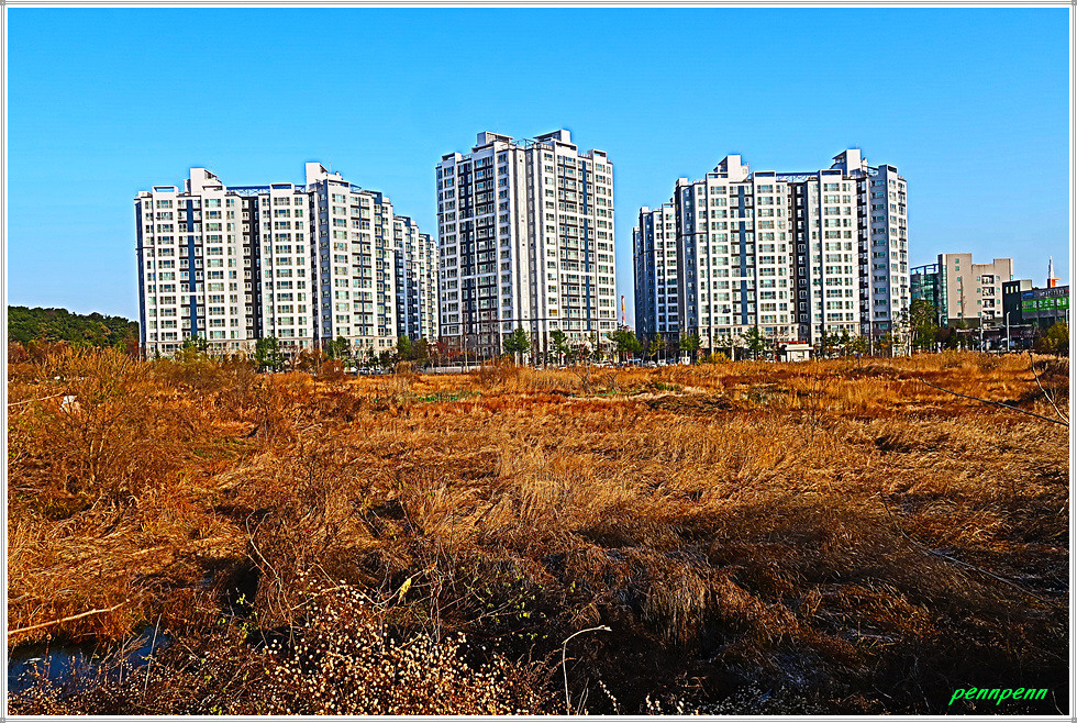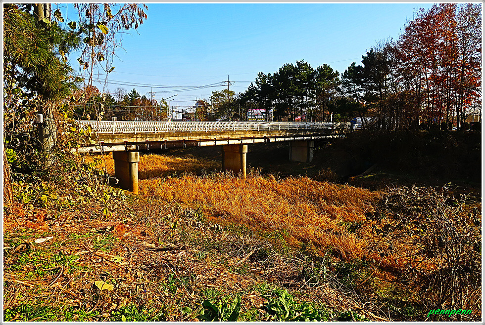 이곳은 서해대교 서단이지만 숲으로 인해 서해대교의 모습은 보이지 않네요. 오늘 15km를 걷는데 4시간 남짓 소요되었습니다. 길을 걷는 내내 포장된 도로만을 걸어 발바닥으로 전해지는 촉감이 매우 딱딱했으며 가을 추수를 끝낸 들판은 상당히 황량했습니다. 다만 일제강점기 작가인 심훈이 말년에 상록수를 집필한 초가인 필경사와 그를 기리는 심훈기념관을 만난 것은 망외의 소득입니다.