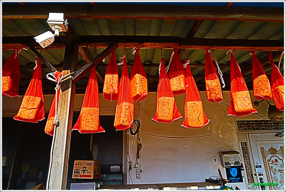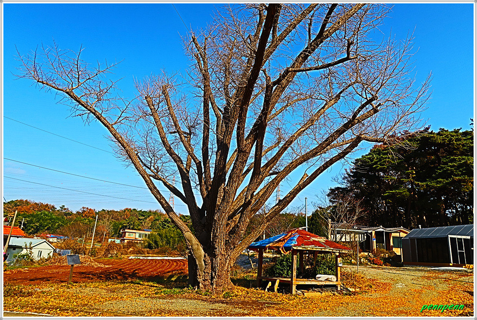 그물망에 메주를 넣어서 말리는 모습이 매우 이채롭습니다. 필자가 자란 시골마을에서는 이런 그물망을 사용하지 않고 그냥 새끼줄로 묶어 걸어 놓았거든요. 월곡리 마을회관과 하나로영농조합법인을 뒤로하고 마을길을 걸어가는데 수령 540년 이상된 보호수 은행나무가 위풍당당한 모습으로 서 있습니다. 여기서도 현대제철소가 보이니 그 방대한 규모를 짐작할 수 있겠지요.