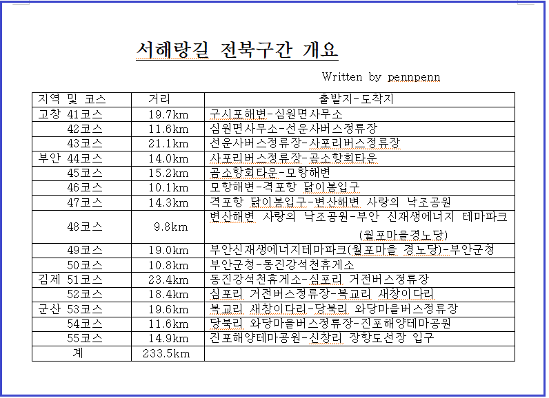 서해랑길 전북구간은 고창군 3개 코스, 부안군 7개 코스, 김제군 2개 코스, 군산시 3개 코스로 모두 15개 코스이며 거리는 234km에 달합니다. 서해랑길 전북구간을 걸으며 만났던 명소 68곳을 소개하겠습니다. 68곳의 명소를 반으로 나누어 제1부와 제2부로 게재하렵니다. 먼저 제1부 고창 41코스부터 부안 47코스까지 35곳의 명소입니다.