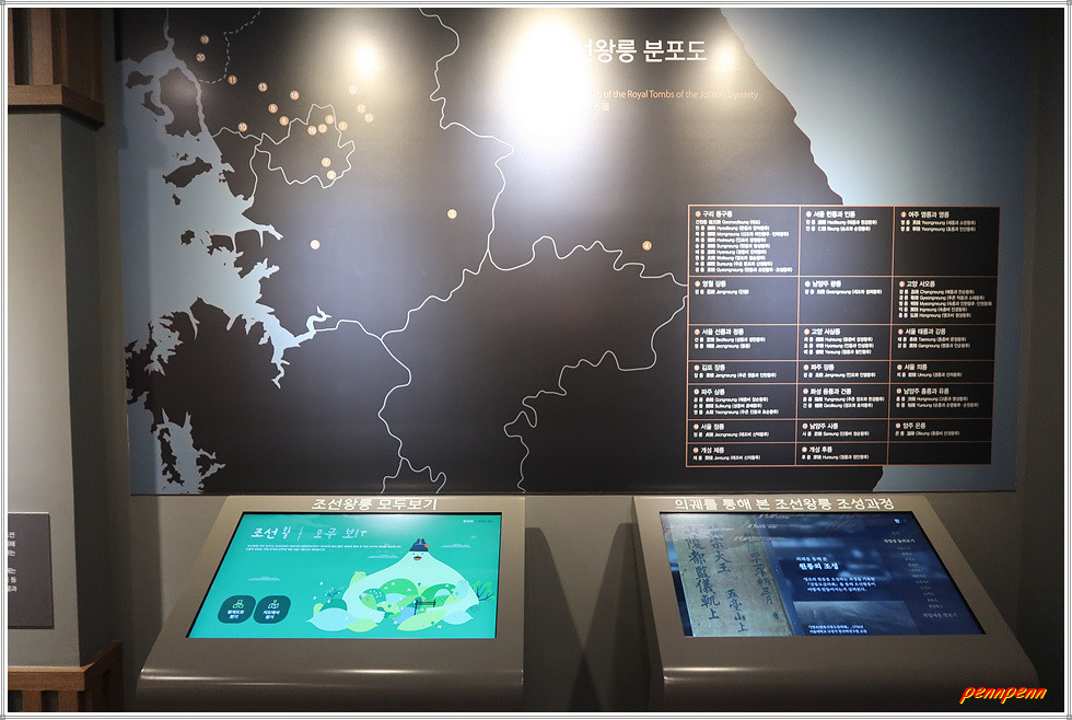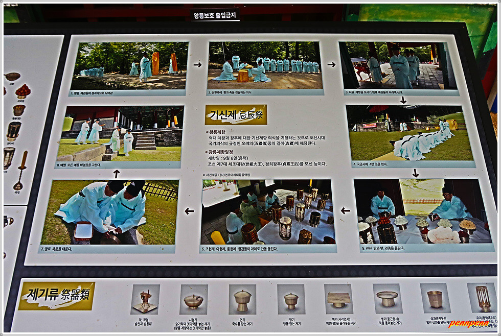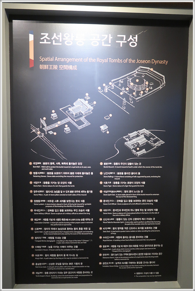정자각은 능에서 제사지낼 때 사용하는 중심 건물로 그 모양이 ‘丁’자와 같아 ‘정자각(丁字閣)’이라고 불렀습니다. 정자각은 봉분 아래에 있으며, 정자각 앞에 홍살문이 있습니다. 정자각 좌우로는 수라간과 수복방이 대칭으로 놓여 정자각 제례에 필요한 간단한 준비를 하게 됩니다. 정자각에는 제례와 관련된 자료를 전시해놓고 있군요.