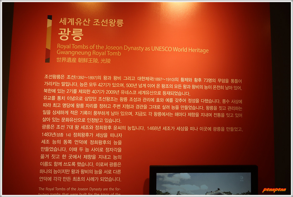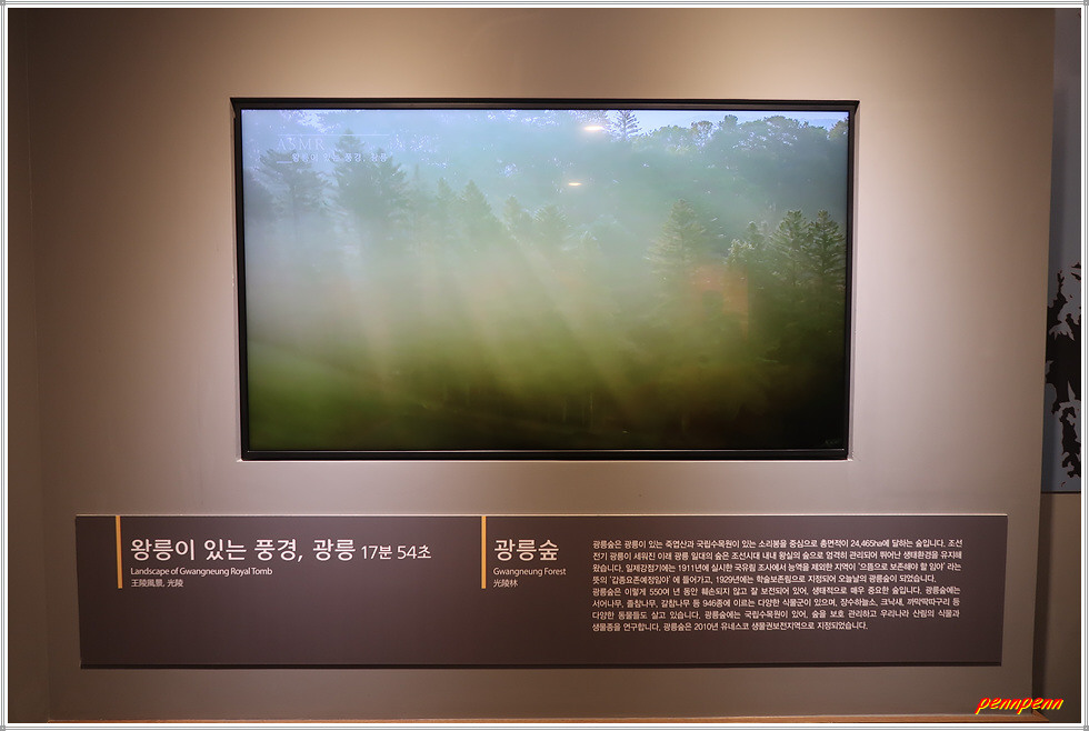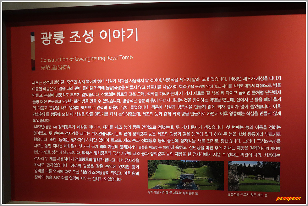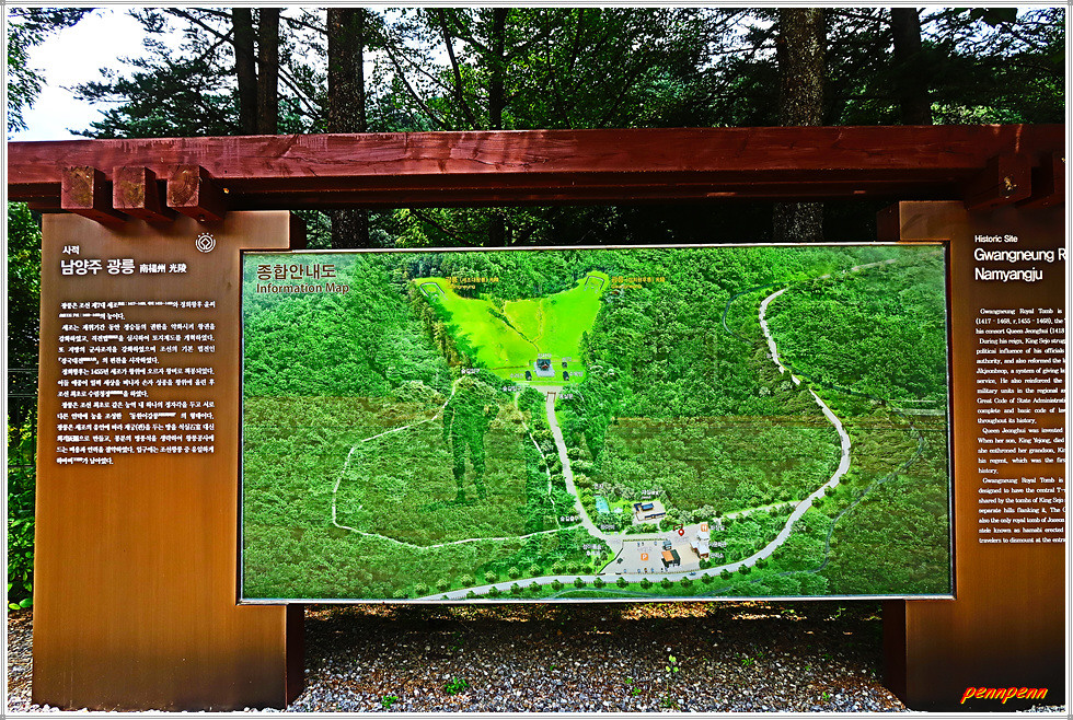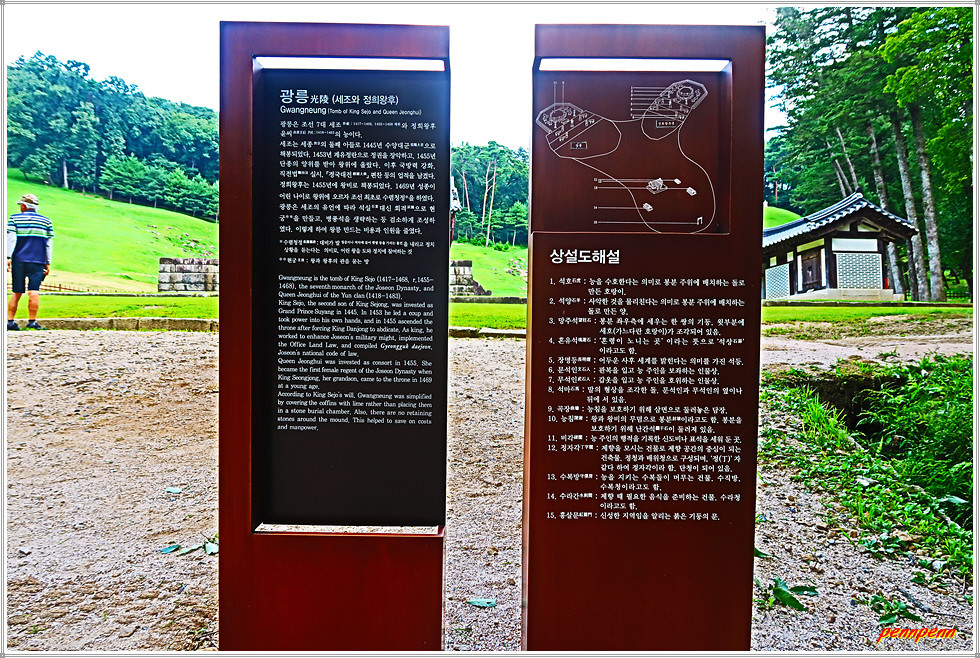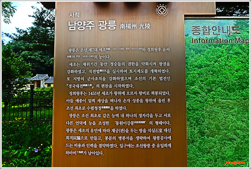 대한불교조계종 25교구 본사인 운악산 봉선사에서 봉선사천변에 조성된 광릉숲길을 따라 가노라면 국립수목원에 이르기 전 우측에 광릉이 있습니다. 주차장 옆에는 속리산 정이품송 후계목 2그루가 잘 자라고 있습니다. 매표소 뒤쪽에는 광릉역사문화관이 있는데 이곳에는 세계유산으로 등재된 조성왕릉, 세조와 정희왕후의 생애, 광릉조성이야기 등을 볼 수 있습니다.