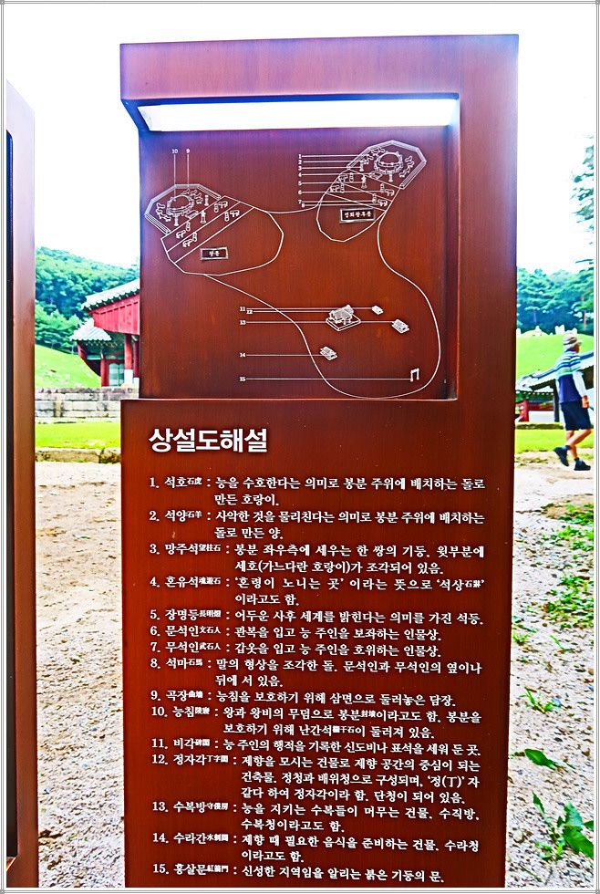 이제 숲길을 따라 안으로 들어가면 홍살문이 있고 그 뒤로 정자각이 보이는데 여기서 다른 왕릉과 비교해 특이한 점은 홍살문에서 정자각으로 이어지는 참도가 없다는 것입니다. 참도는 홍살문에서 정자각까지 이어진 길로 좌측의 신도(神道)와 우측의 어도(御道)로 나누어 지는게 원칙입니다. 국가유산청의 광릉안내문에는 “참도가 한국전쟁 때 소실된 것으로 보인다”고 했는데 사실이라면 왜 복원을 하지 않았는지 의문입니다.