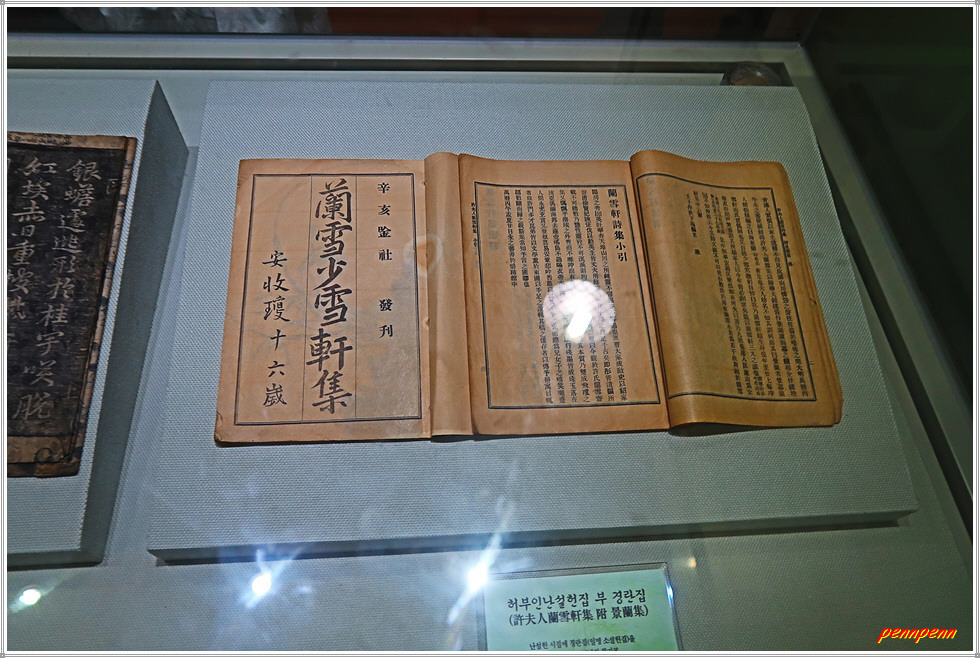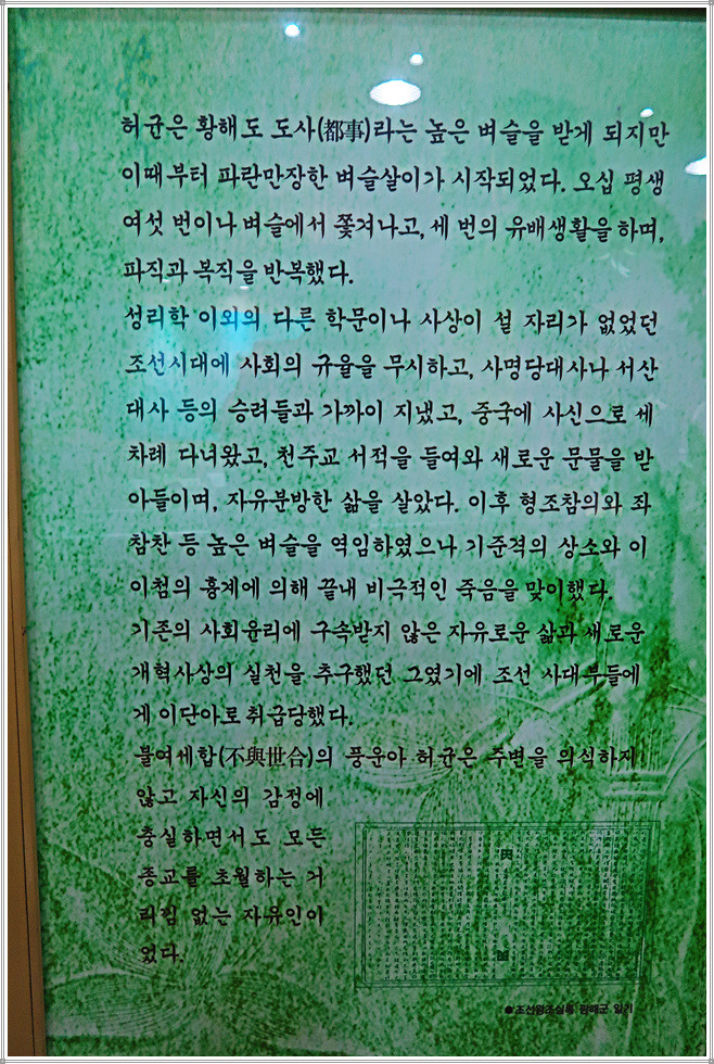 기념관은 목조 한식 기와로 이루어진 단층 건물로 내부는 네모나게 난 통로를 따라 들어가면 안내 데스크와 만나고 이어 주전시실과 소전시실로 이어집니다. 허씨5문장은 허균(1569-1618)을 비롯해 아버지 허엽(1517-1580), 이복 형 허성(1548-1612), 친형 허봉(1551-1588), 친누나 허난설헌(1563-1589)을 말합니다.