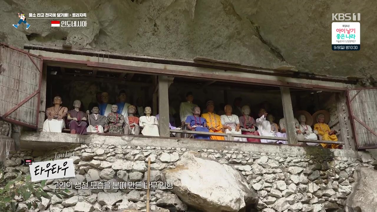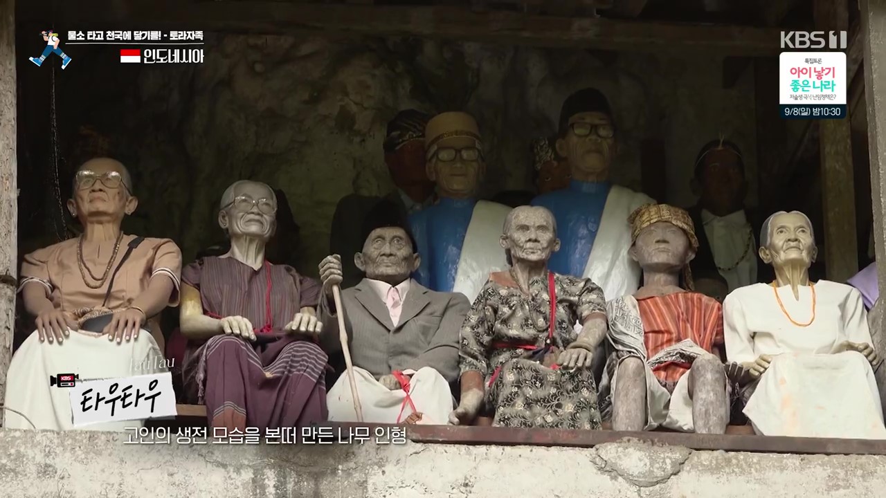 통코난은 토라자 족의 전통가옥으로 보리 파린딩은 토라자 족 상류층의 장례식 장소로 고인의 고귀함을 상징하는 거석(巨石)을 세웁니다. 무덤에는 고인이 아꼈던 물건을 놓아두는 풍습이 있네요. 무덤을 절벽에 만든 것은 동물들로부터 시신훼손을 막기 위함입니다. 이들은 동굴에도 시신을 안치했습니다. 높은 절벽의 관은 상류층의 관입니다. 고인의 생전모습을 따서 만든 나무인형을 타우타우라고 부릅니다. 동굴 내부에도 관이 많습니다.