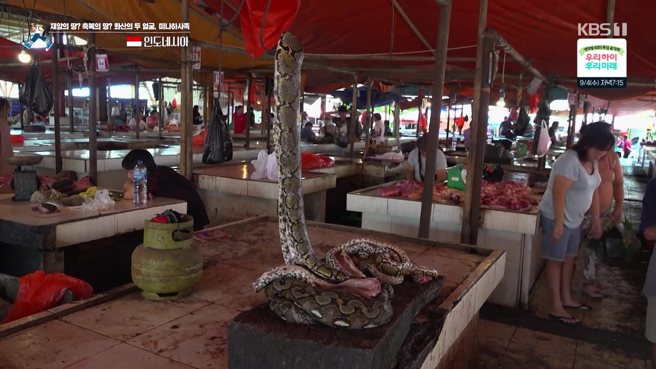 술라웨시는 세계에서 11번째로 큰 섬으로 마나도는 술라웨시 우타라주의 주도로 북 술라웨시 여행의 거점도시입니다. 인도네시아 국민의 약 88%는 이슬람교인이지만 특이하게도 이곳 북술라웨시 지역은 인구의 80% 이상이 기독교를 믿습니다. 토모혼 식재료 전통시장에는 매우 큰 비단구렁이도 판매하고 있는데 미나하사족이 잘 먹는다고 합니다. 박쥐도 식재료로 판매합니다. 당국은 개체수 관리를 위해 이들 생물의 포획을 허용합니다.