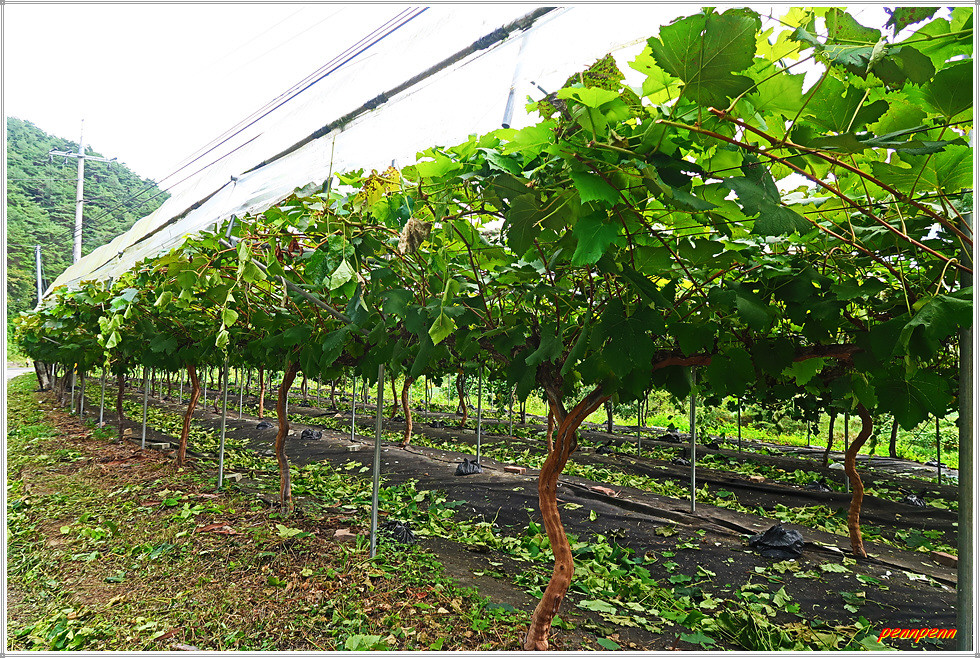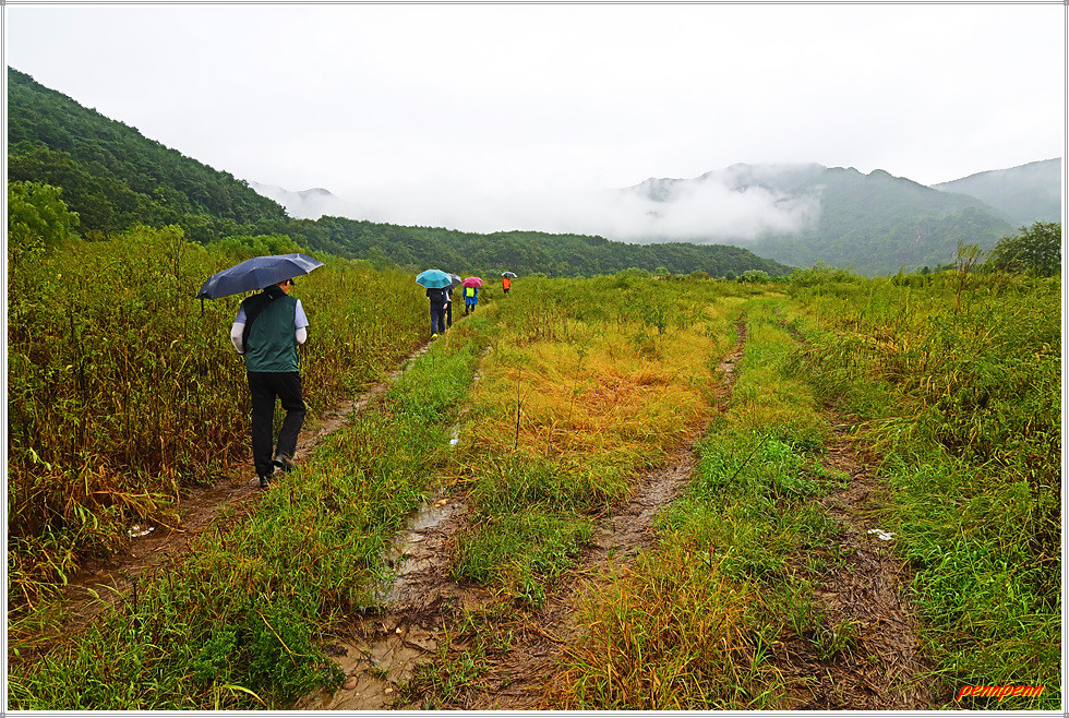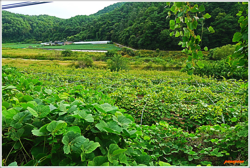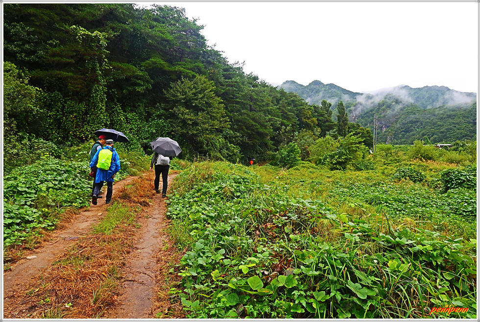 이제 도로를 벗어나 우측으로 진입합니다. 그런데 잠시 분명하던 오솔길은 그간 많은 비가 내린 탓인지 침수된 곳도 있어 길이 분명치 않습니다. 그래도 선두대장이 길을 잘 해쳐나가 임도를 만났고 이어서 도로(왕모산성길)를 만나 길을 제대로 찾았습니다. 안동영화예술학교와 농기구가 많은 곳을 지나자 주렁주렁 매달린 대추가 길손을 유혹하지만 하나도 건드리지 않고 그냥 지나칩니다.