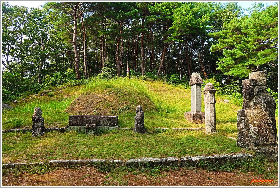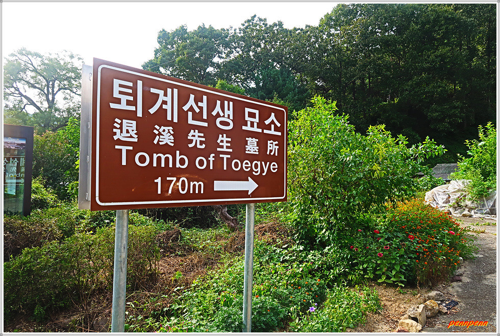 여기서 좌측으로 170m 지점에 퇴계 이황 선생의 묘소가 있습니다. 거리는 가깝지만 묘지까지는 매우 가파른 계단이어서 각오를 단단히 새겨야합니다. 오르막이 시작되기 전에 있는 무덤은 퇴계선생며느리(봉화금씨) 묘소입니다. 여기서부터 돌계단과 통나무계단을 힘들여 오르면 퇴계의 묘소인데 퇴계의 유언에 따라 소박하게 조성된 무덤으로 2기의 문인석이 있습니다. 비석의 전면에는 퇴도만은진성이공지묘(退陶晩隱眞城李公之墓)가 새겨져 있고 그가 죽기 나흘 전 썼다는 자명문(自銘文)의 유언이 있습니다. 이황의 호는 퇴계, 퇴도, 도수, 청량산인으로 이중에서 퇴계가 가장 잘 알려진 호입니다.