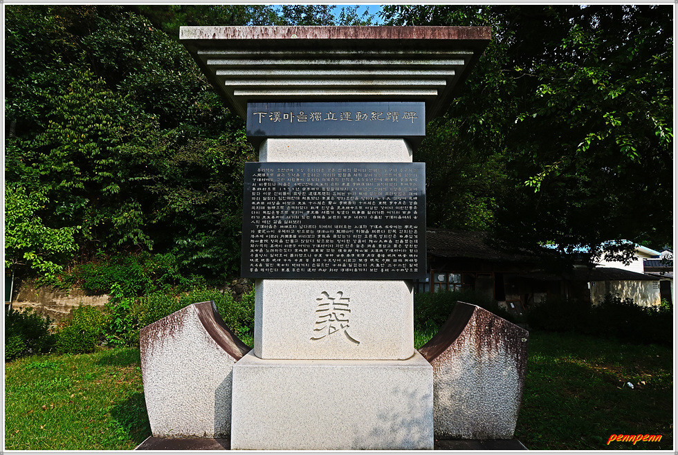 도로변에는 큰 거목이 울창하고 송림의 정자(토계마을쉼터)는 길손이 쉬어가기에 안성맞춤입니다. 이곳은 청포도길로 그 이름처럼 도로변에는 포도밭이 자주 보입니다. 하계마을독립운동기적비는 항일독립운동가들의 공적을 기리기 위해 세운 현충시설입니다.