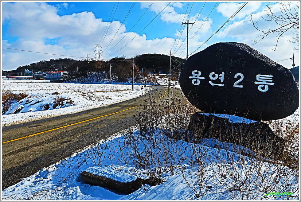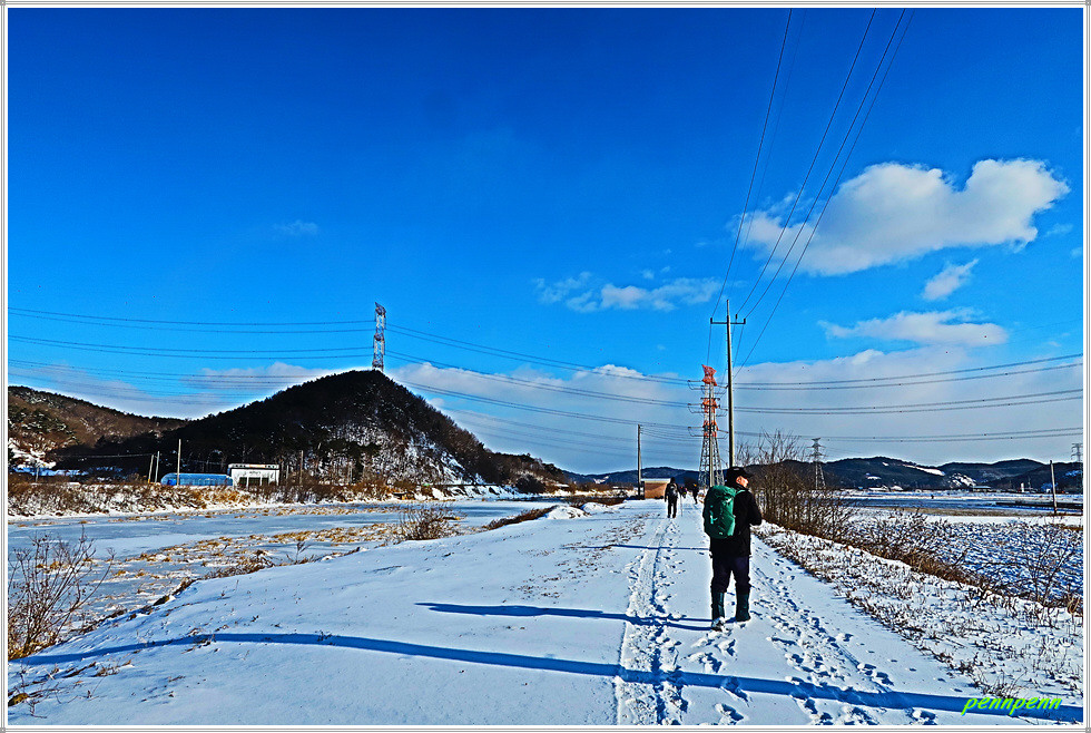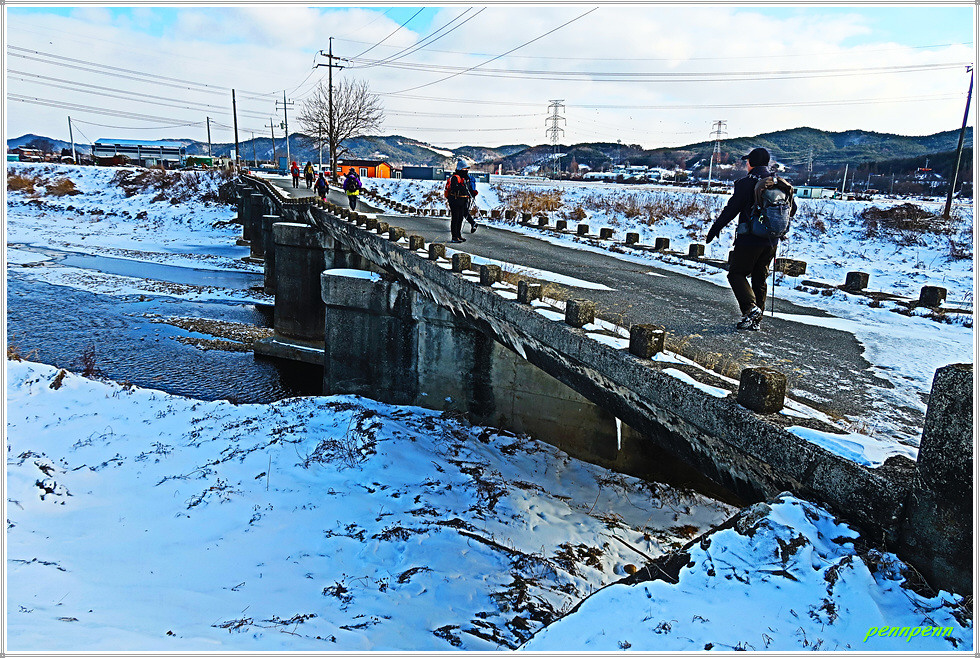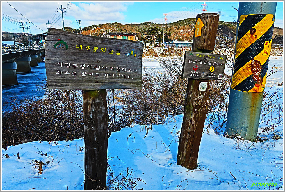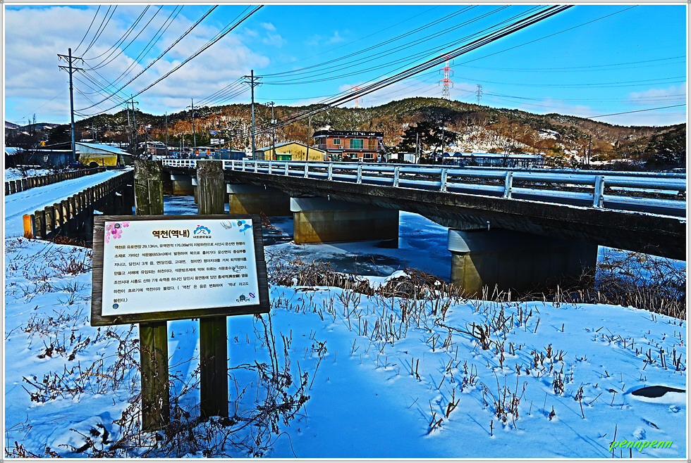 역천 동쪽 도로에서 북상하다가 우측으로 진입해 논과 밭 사이를 걷습니다. 지난 이틀간 내린 눈으로 인해 대지는 설국으로 변한 모습입니다. 갈림길에서 영탑사 이정표를 따라 걷는데 이곳의 이정표는 원효깨달음길이 아니라 내포불교순례길로 변경해 놓았군요. 차량통행이 금지된 교량을 건너 다시 역천을 만나 북상합니다. 역천 너머로 신성대학교가 보이는군요.
