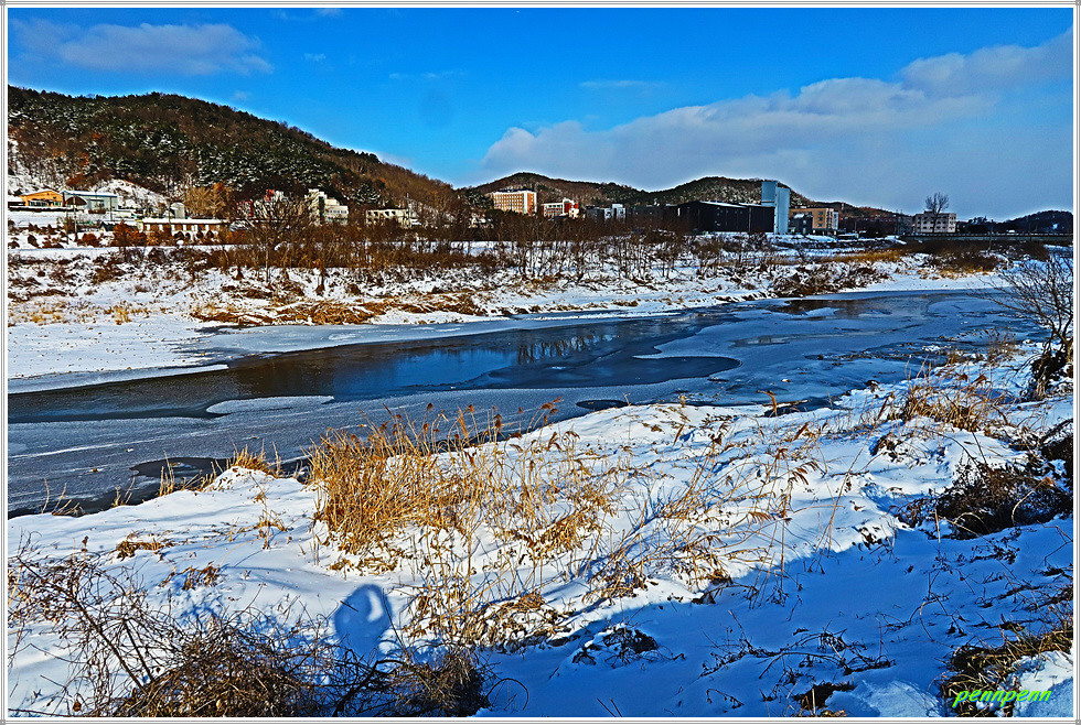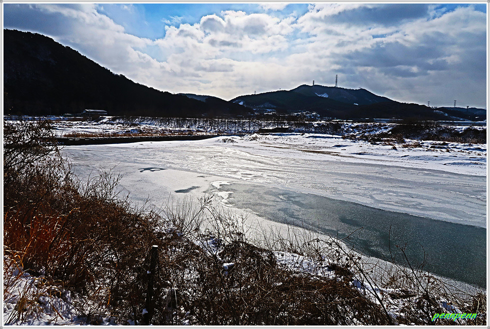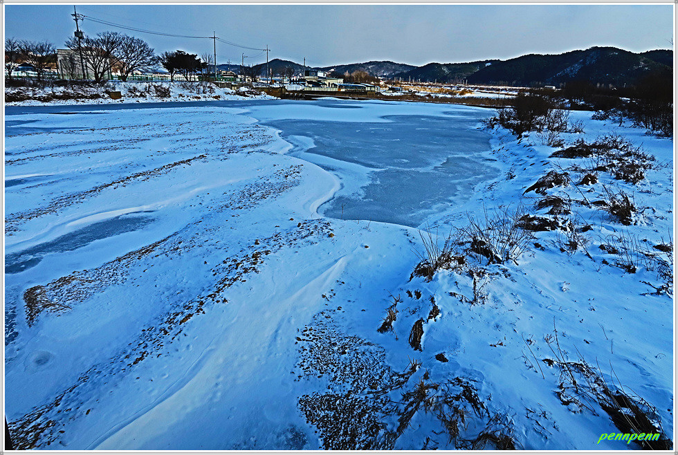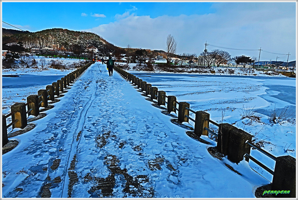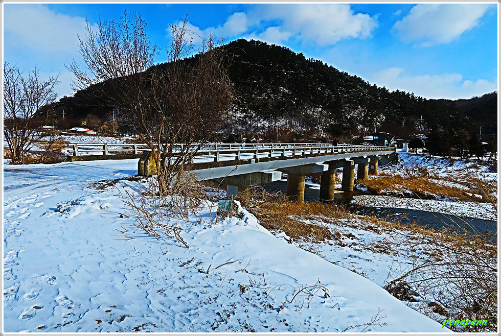 역천 동쪽 도로에서 북상하다가 우측으로 진입해 논과 밭 사이를 걷습니다. 지난 이틀간 내린 눈으로 인해 대지는 설국으로 변한 모습입니다. 갈림길에서 영탑사 이정표를 따라 걷는데 이곳의 이정표는 원효깨달음길이 아니라 내포불교순례길로 변경해 놓았군요. 차량통행이 금지된 교량을 건너 다시 역천을 만나 북상합니다. 역천 너머로 신성대학교가 보이는군요.