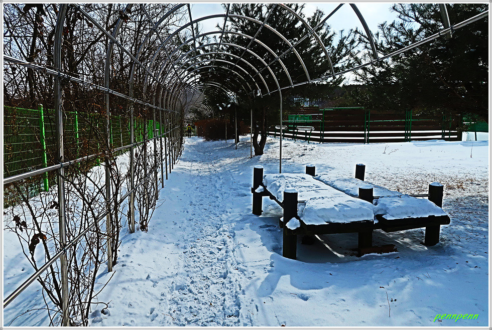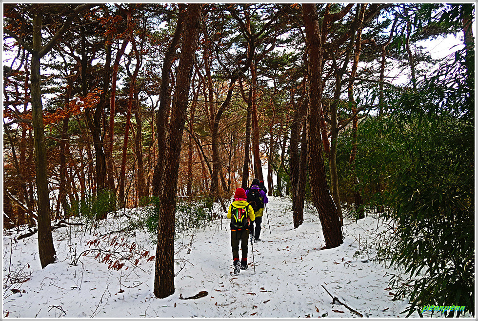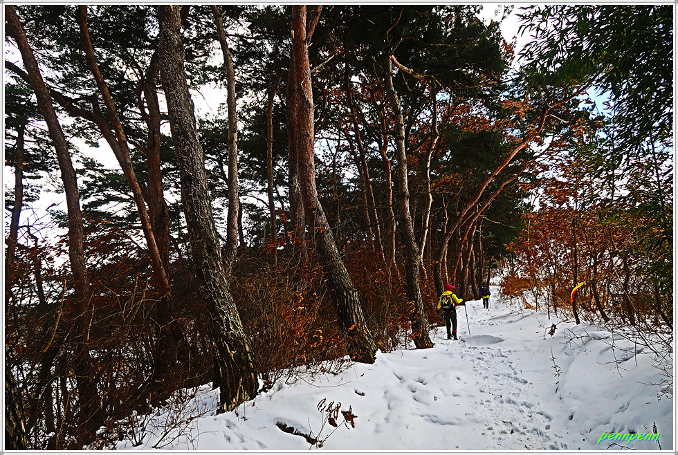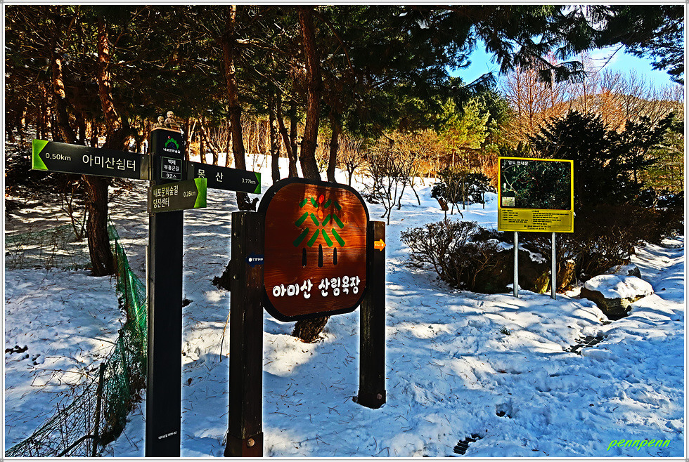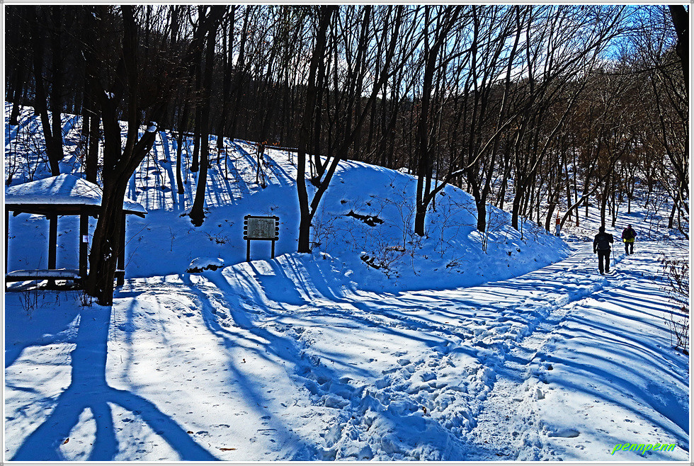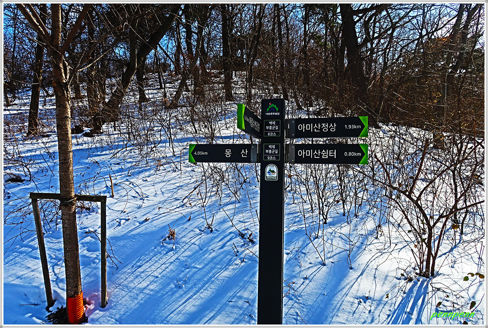 공원묘지와 통신철답을 뒤로하고 가파른 나무계단을 내려가 서해안 고속도로 굴다리를 통과해 좌측으로 조금 갑니다. 잠시 후 우측 숲길을 통과하니 다시 숲길은 맞은편 언덕으로 이어져 정말 지치게 만듭니다. 몽산과 아미산 갈림길에서 우측 아미산 쉼터방면으로 갑니다. 임도에는 정말 많은 눈이 쌓여있군요.