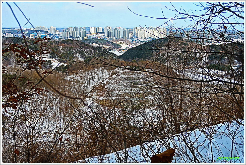 대덕공원에서 다시 맞은편 숲으로 오릅니다. 길목에는 눈티고개 서낭당이라는 안내문이 있군요. 눈티고개는 조선시대 당시 면천군과 당진현을 잇는 가장 큰 대로가 있던 곳으로 군수와 현감이 다니던 길이었기 때문에 서낭당이 있어 통행인들의 재난을 막고 복을 빌었다고 합니다. 능선 좌측으로는 당진시가지의 아파트 숲이 보입니다.