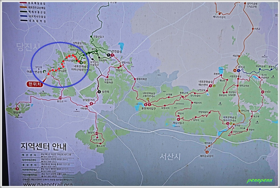 서해랑길은 103개의 본선(해안노선)과 6개의 지선(내륙노선)으로 구성되어 있는데, 지선은 서산지역 4개 코스(64-1,2,3,4) 및 당진지역 2개 코스(64-5,6)입니다. 서해랑길 서산 64-4코스는 서산시 운산면 용장리 운산교에서 출발해 당진시 면천면 죽동리 내포문화숲길방문자센터에 이르는 18.7km의 도보길입니다. 그런데 두루누비에서는 이번 코스를 "아름다운 땅 내포의 역사와 근대건축문화의 미를 탐방할 수 있는 코스로서 1900년대에 지어진 한옥으로 숙박과 민화 강습을 진행하는 서산 유기방가옥을 만날 수 있다"고 소개하고 있지만 원래 코스에서 서쪽으로 약 2.5km∼3km정도 떨어져 있어 보통사람들은 들리기가 어렵습니다.