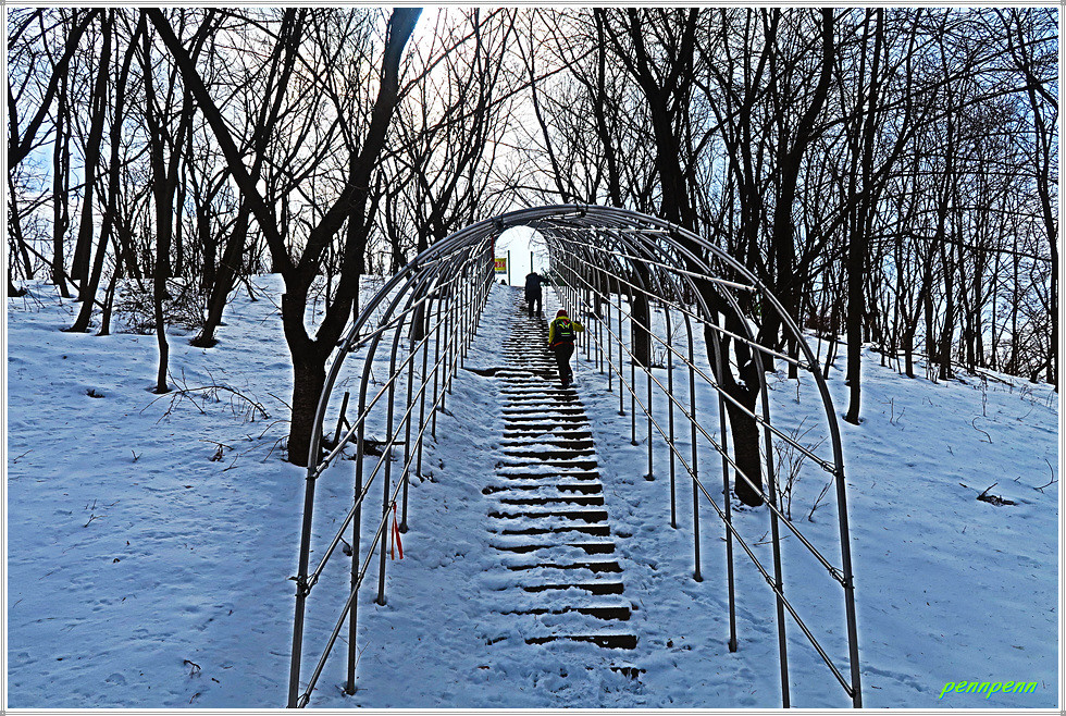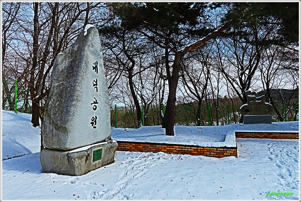 어름수변공원 갈림길에서 아미산 정상 이정표를 따라 우측으로 방향을 돌립니다. 산속의 등산로에는 눈이 많이 쌓여 있군요. 고개를 하나 넘었는데 또 다시 긴 오르막 계단이 앞에 버티고 있어 한숨이 절로 나옵니다. 위 평지에는 체육시설이 보이는데 이를 넘어가니 대덕공원 표석이 반겨주네요.