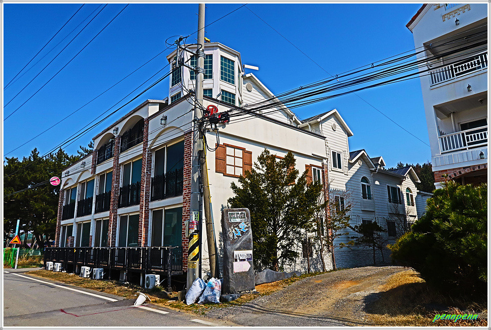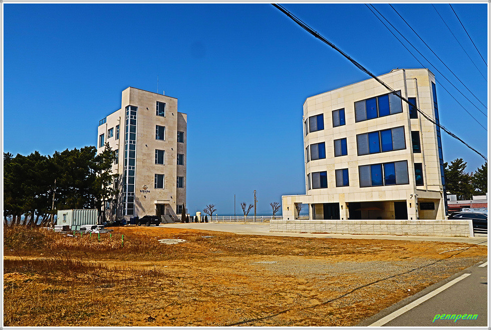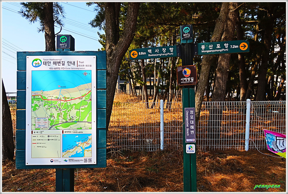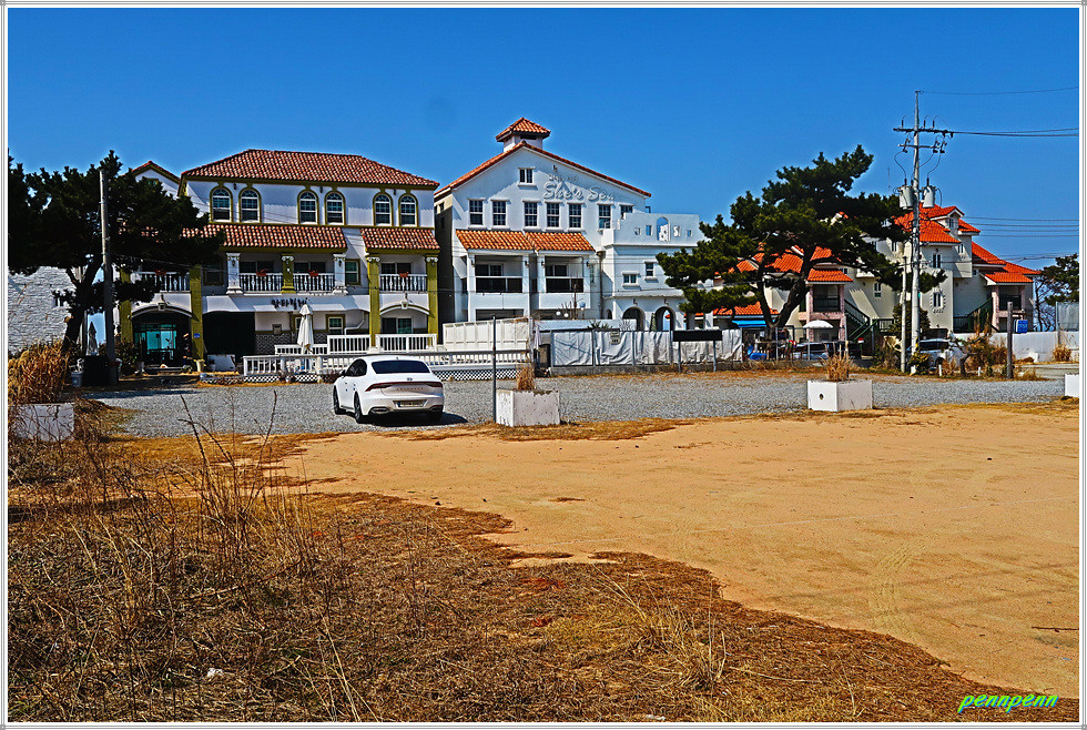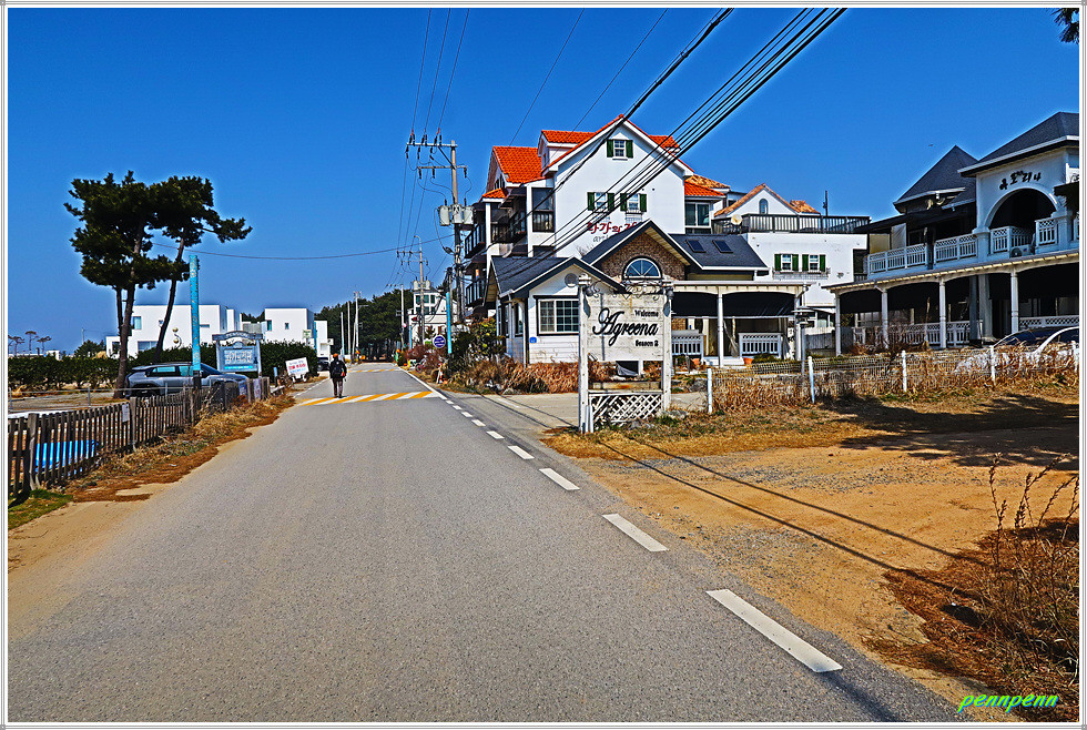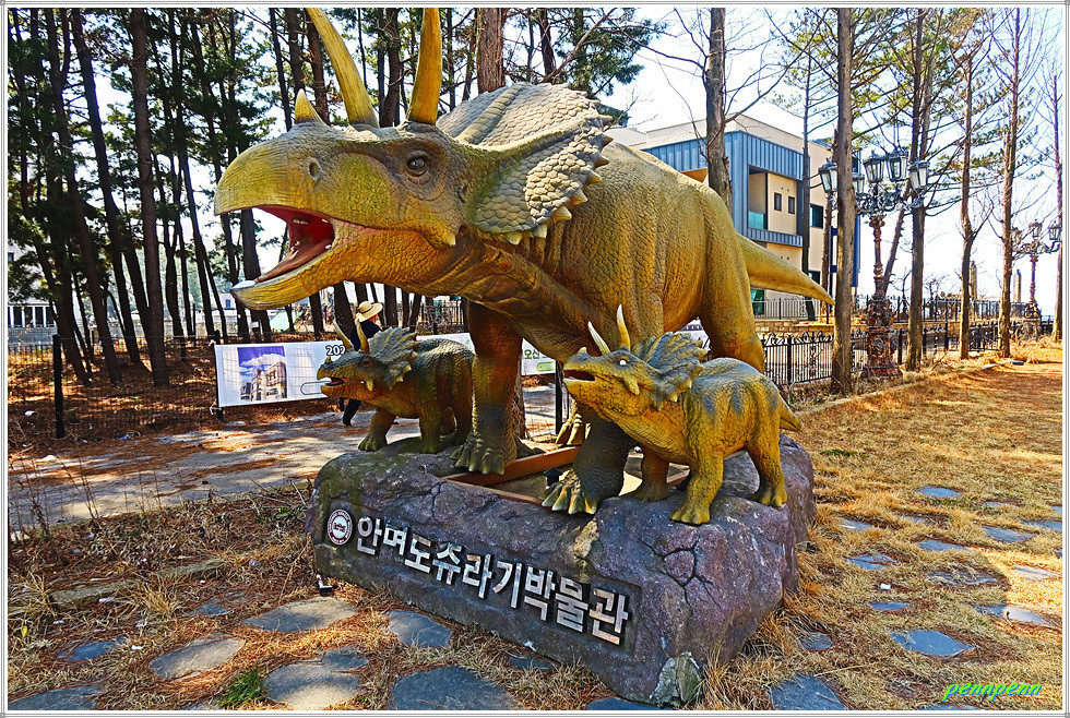 청포대해변에는 현대식으로 지은 펜션, 카페, 기업체연수원 등 다양한 편의시설이 입주해 있더군요. 이 길은 지난해 조성한 동서트레일 2구간이기도 합니다. 안면도 쥬라기 박물관은 여기서 남쪽으로 상당이 떨어져 있는데 이를 홍보하기 위해 이곳에 조형물을 설치한 것 같습니다.