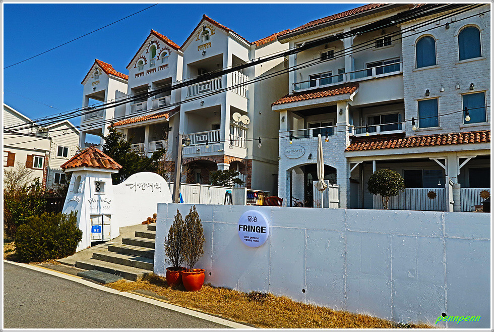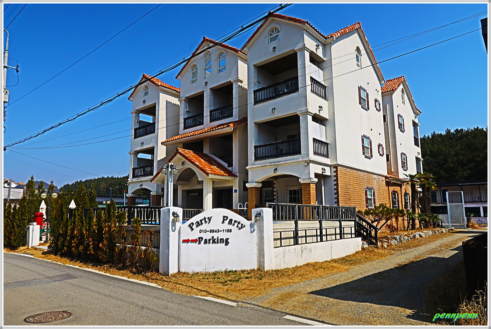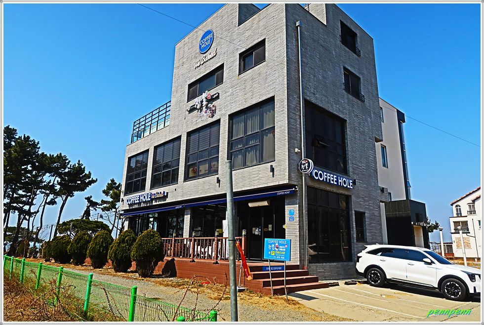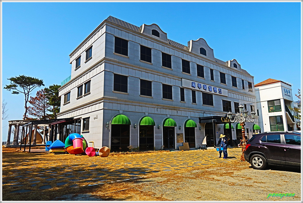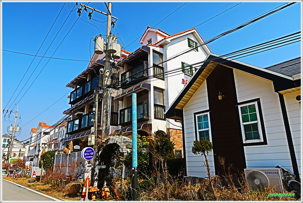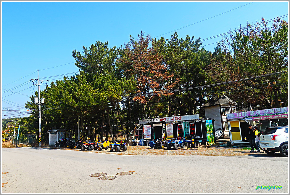 청포대해변에는 현대식으로 지은 펜션, 카페, 기업체연수원 등 다양한 편의시설이 입주해 있더군요. 이 길은 지난해 조성한 동서트레일 2구간이기도 합니다. 안면도 쥬라기 박물관은 여기서 남쪽으로 상당이 떨어져 있는데 이를 홍보하기 위해 이곳에 조형물을 설치한 것 같습니다.
