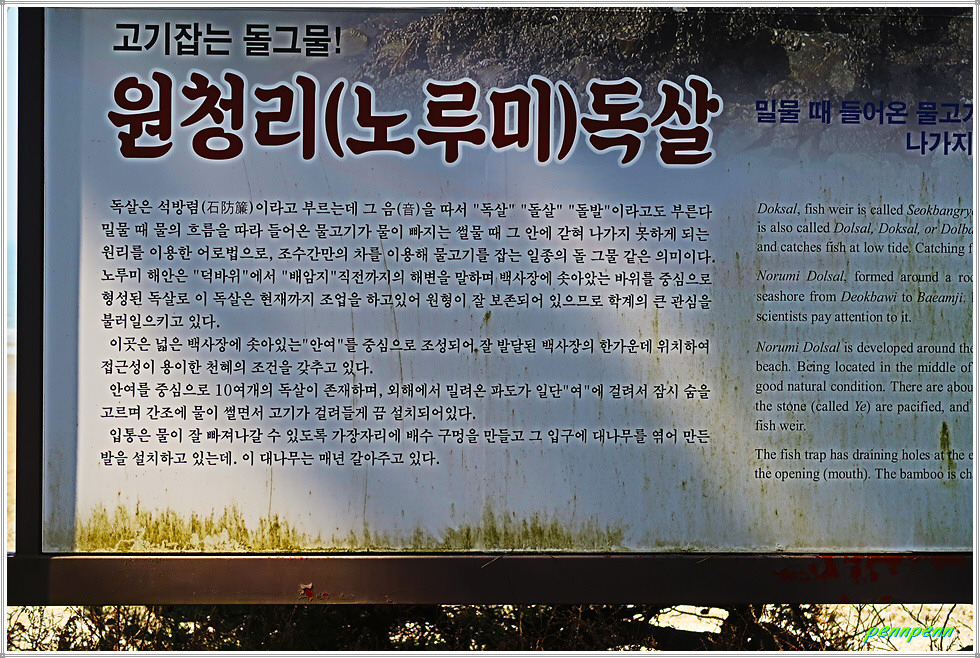 이곳 별주부마을은 돌 그물로 고기를 잡는 독살문화가 전승되는 곳입니다. 원청리(노루미) 독살은 석방렴이라고도 부르는데 밀물 때 물의 흐름을 따라 들어온 물고기가 물이 빠지는 썰물 때 그 안에 갇혀 나가지 못하게 되는 원리를 이용한 어로법입니다. 이는 조수간만의 차를 이용해 물고기를 잡은 일종의 돌 그물 같은 원리입니다. 이곳의 독살은 현재까지도 원형이 잘 보존되어 조업을 하고 있다는군요.