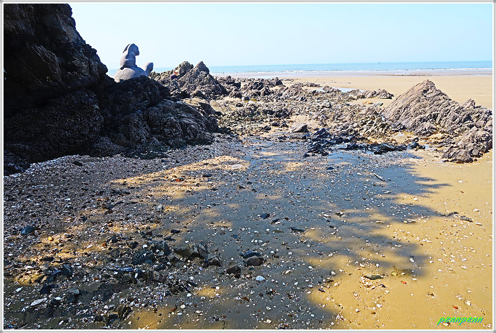 바위 뒤로 돌아 바다 쪽으로 가면 독살이 있습니다. 그런데 독살보다 더욱 필자의 관심을 끈 것은 거북이등에 올라탄 토끼상(별주부상)입니다. 이 거북이는 토끼를 업은 채 자기가 떠나온 용궁을 하염없이 바라보고 있답니다.