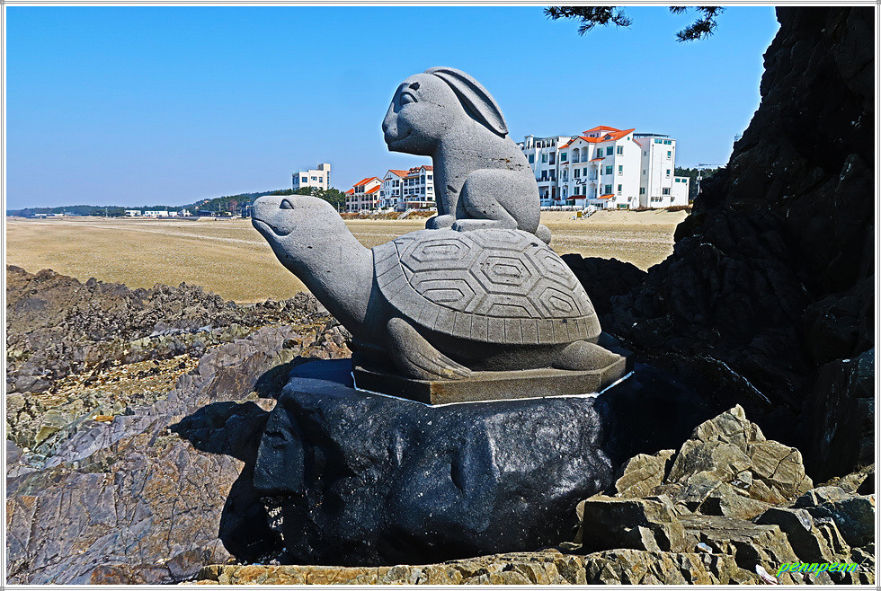 다시 해변가로 오니 별주부전의 유래비가 보입니다. 이 마을은 작자와 연대를 알 수 없는 조선후기 판소리 계열의 동물을 의인화한 우화소설의 하나인 “별주부전마을”로 자라가 용왕의 명을 받고 토끼의 생간을 구하기 위해 처음으로 육지에 올라온『용새골』을 비롯하여 유혹에 넘어간 토끼가 자라의 등에 업혀 수궁으로 들어간 후 위기를 모면하기 위하여 간을 떼어 청산녹수 맑은 샘에 씻어 감추어 놓고 왔다는『묘샘』, 구사일생으로 육지에 돌아온 토끼가 간을 떼어 놓고 다니는 짐승이 어디 있느냐며 자라를 놀려댄 후 사라진『노루 미재』, 죽어있던 자라가 바위로 변한『자라바위(덕바위)』와 수궁 앞에 위치한『궁앞』과 안궁』등이 “별주부전마을”임을 한층 더 입증하고 있습니다.