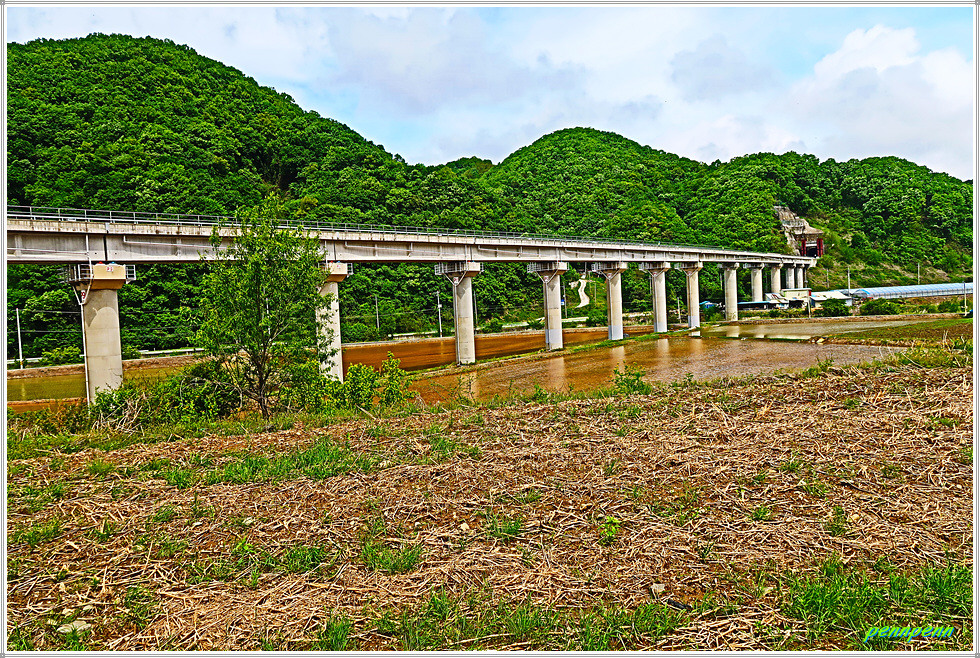 차탄천을 따라 서북쪽으로 걷다가 새로운 교량공사가 한창인 지점에서 공사 옆 임시가교를 이용해 차탄천을 건넌 후 용천교를 이용해 다시 차탄천 북단으로 갑니다. 곰기천교 안쪽에는 국립연천현충원 조성예정지가 있군요. 현재 국립현충원은 서울과 대전에 있는데 이곳 연천에도 새로 조성할 계획인 듯합니다. 이쪽에는 벌써 모내기를 마쳤네요. 차탄천에 걸린 잠수교를 건너 차탄천 우측으로 갑니다. 도로변의 고랭지 채소밭에는 농부들이 농약을 살포하고 있습니다. 차탄천교 굴다리를 통과해 우측으로 구부러져 민가가 있는 동네로 진입합니다.