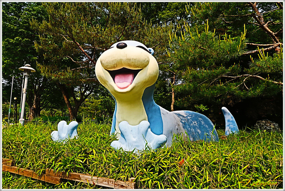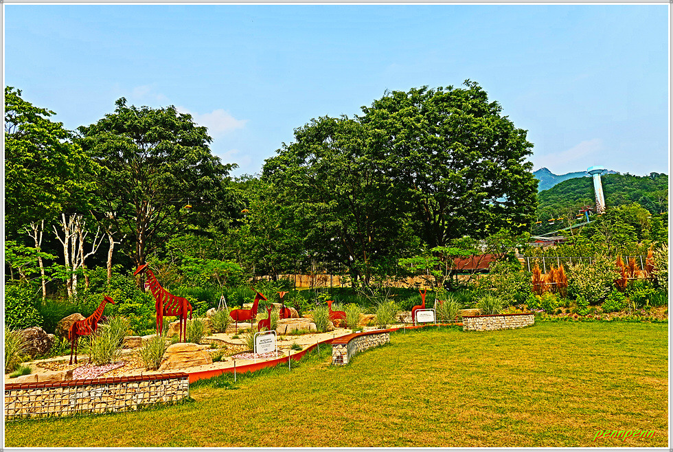 여기서 우측으로 들어섭니다. 판다가 휴식을 취하고 있는 조형물과 스카이리프트 탑승장을 지나 좌측으로 몸을 돌려세우면 지구본처럼 보이는 그라운드 플래닛(어린이 종합 놀이터)이 보입니다. 메타세쿼이아 가로수 길을 걸으며 교량에 진입하면 대공원 뒤로 청계산(618m)이 우뚝합니다.