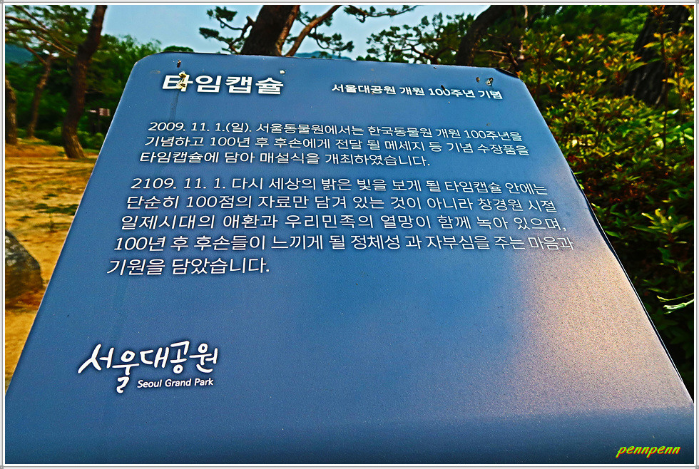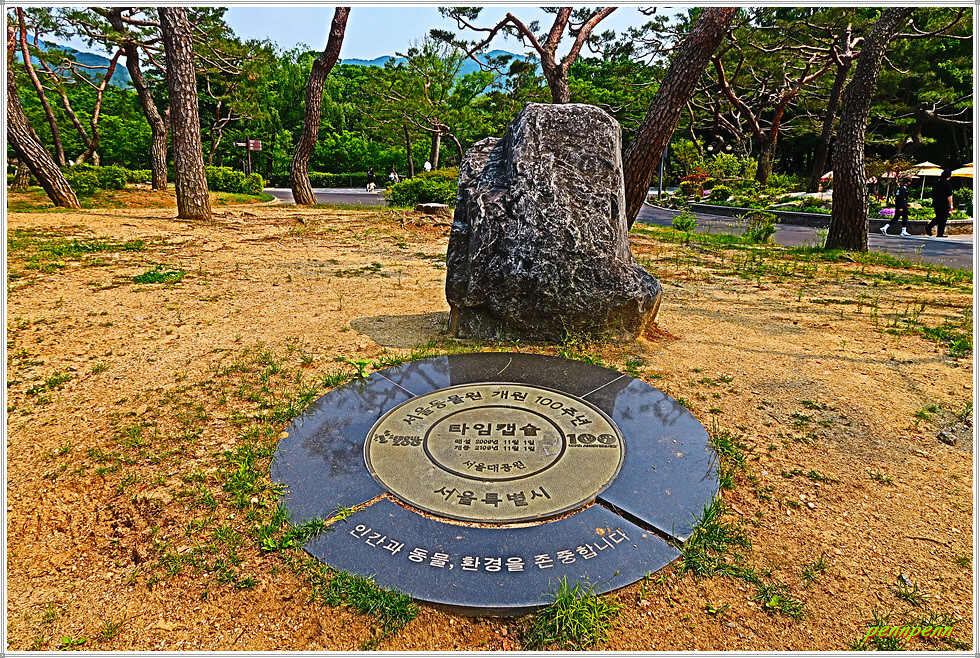 <서울동물원 개원 100주년 기념 타임캡슐> 2009년 개원 100주년을 맞아 100년 후 후손에게 전달할 메시지 등 기념수장품을 타임캡슐에 담아 매설한 것입니다. 이 안에는 창경원 시절 일제시대의 애환과 우리민족의 열망이 함께 녹아있으며, 100년 후 후손들이 느낄 정체성과 자부심을 주는 기원을 담았다고 합니다.
