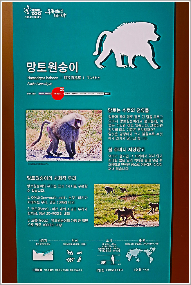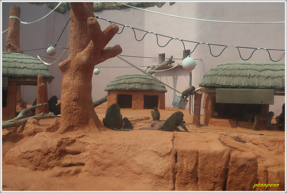 <유인원관> 앞에는 가족음악회라는 조각작품(장진영 작)이 있는데 이는 고릴라 가족들이 악기를 들고 연주하는 모습을 형상화한 것입니다. 이곳에는 오랑우탄, 침팬지, 원숭이, 고릴라 등이 살고 있습니다. 망토원숭이는 얼굴과 목에 망토 같은 긴 털을 갖고 있어 붙여진 이름으로 수컷의 전유물이며 암컷은 엉덩이가 크고 붉을수록 인기가 많다고 합니다.