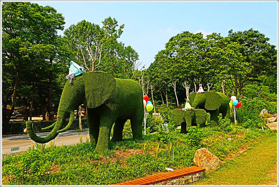 서울지하철 4호선 대공원역 2번 출구로 나가면 “I ♥ SEOUL GRANDPARK"이라는 영문글씨가 방문객을 맞아줍니다. 이곳 진입로의 양쪽은 넓은 주차장인데 진입로 끝에는 ”접어 만든 사자와 아이“(이호준 작)와 ”나들이“(김래환 작) 조각 작품이 전시되어 있습니다. 두 점의 작품 모두 서울대공원을 잘 표현했군요. 중앙에 크게 보이는 건축물은 종합안내소 겸 코끼리 열차 승하차장이 있는 곳입니다. 동물원으로 가는 방법은 코끼리열차를 타거나 스카이리프트 이용이 가능하지만 모두 유료입니다.