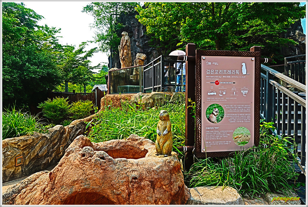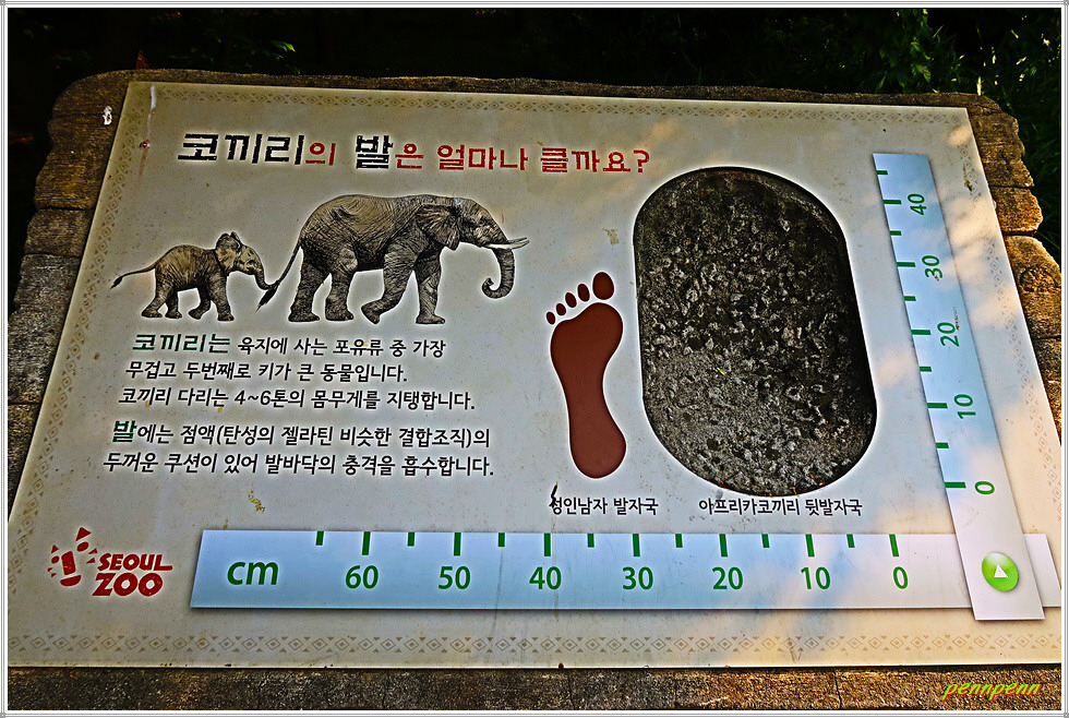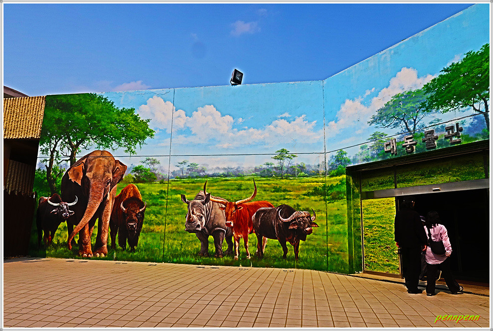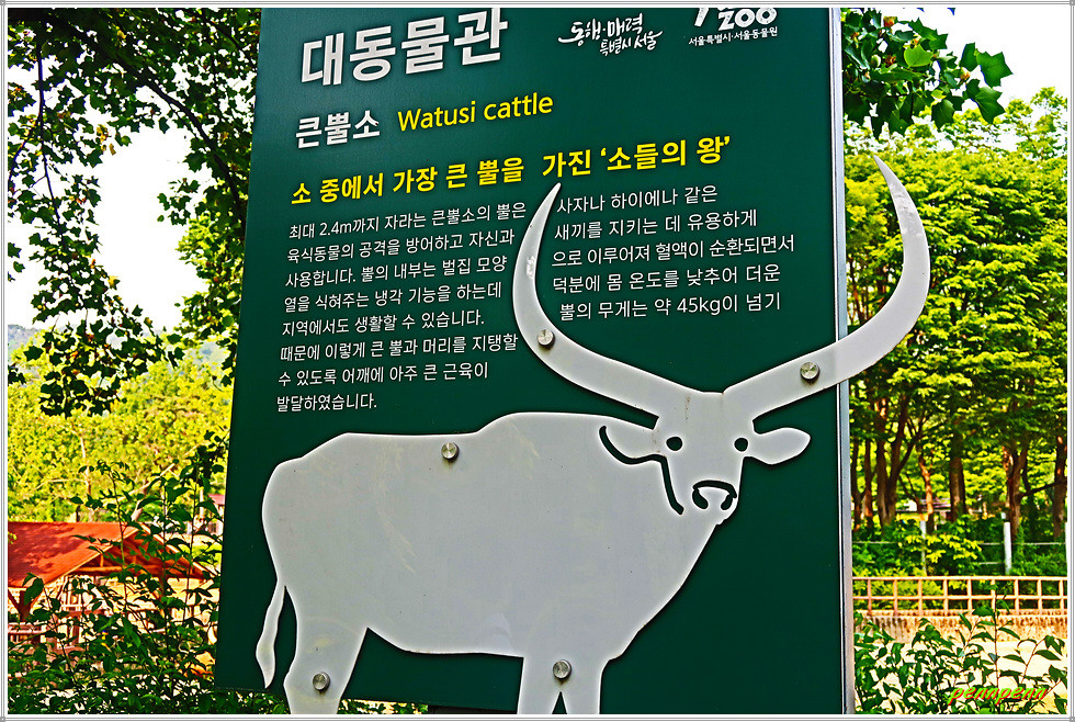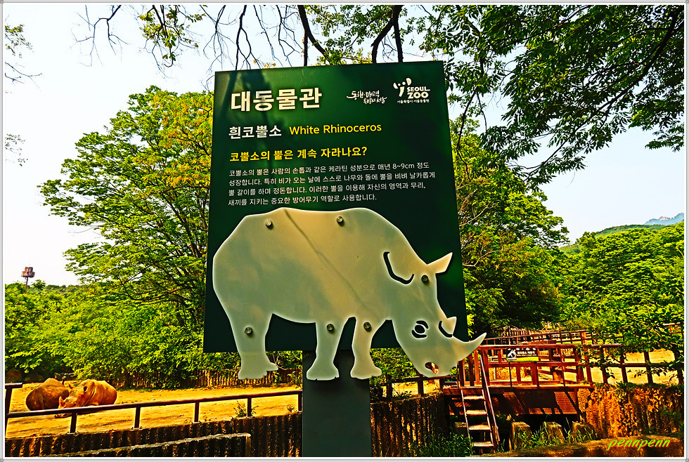 <대동물관>에는 아시아 코끼리, 아메리카 물소, 큰뿔소, 흰코뿔소가 살고 있습니다. 대동물관 앞에는 코끼리를 비롯한 각종 동물들을 형상화한 조형물이 설치되어 있네요. 큰뿔소는 소 중에서 가장 큰 뿔을 가져 “소들의 왕”이라고 불립니다. 최대 2.4m까지 자라는 뿔은 사자나 하이에나 같은 육식동물의 공격을 보호하고 자신과 새끼를 지키는 기능을 합니다. 뿔의 무게가 무려 45kg으로 이를 지탱하기 위해 어깨의 근육이 매우 강합니다.