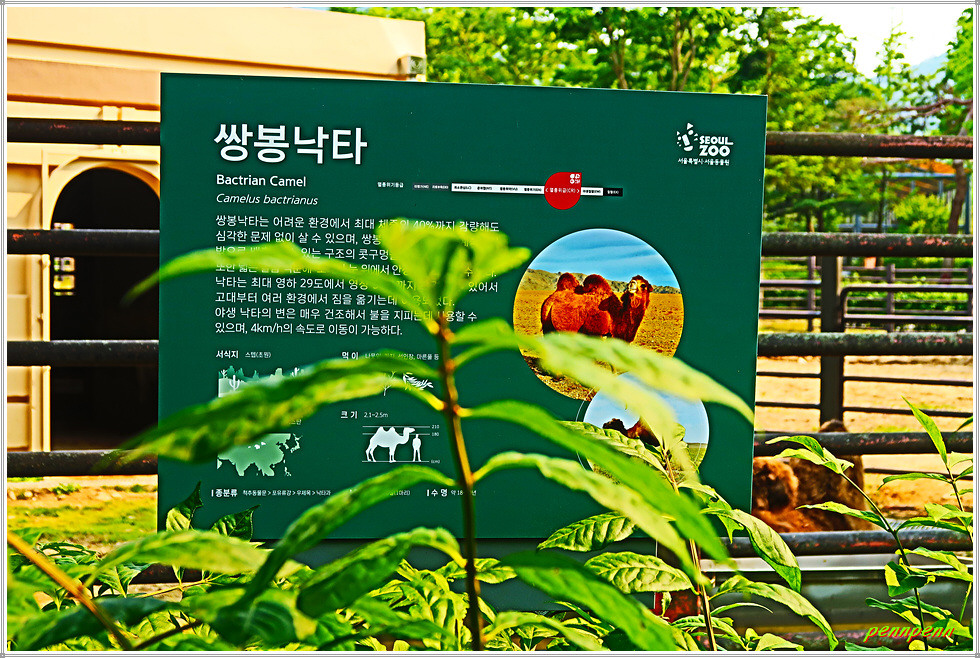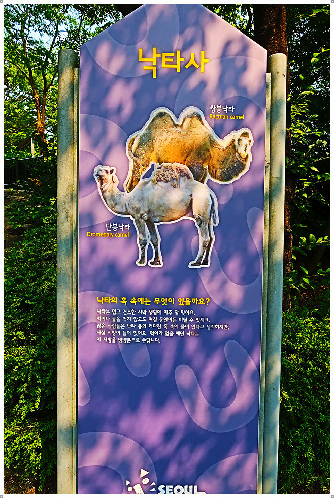 <낙타사>에는 단봉낙타와 쌍봉낙타가 있습니다. 단봉낙타는 몸길이는 2미터 정도이며, 등에는 지방을 저장하는 한 개의 혹이 있습니다. 아라비아, 북아프리카, 아시아 남서부에서 가축으로 사육되며 사막의 교통수단으로 이용됩니다. 그런데 쌍봉낙타는 담벼락 울타리 쪽에 앉아 있어 사진을 찍을 수가 없더군요.