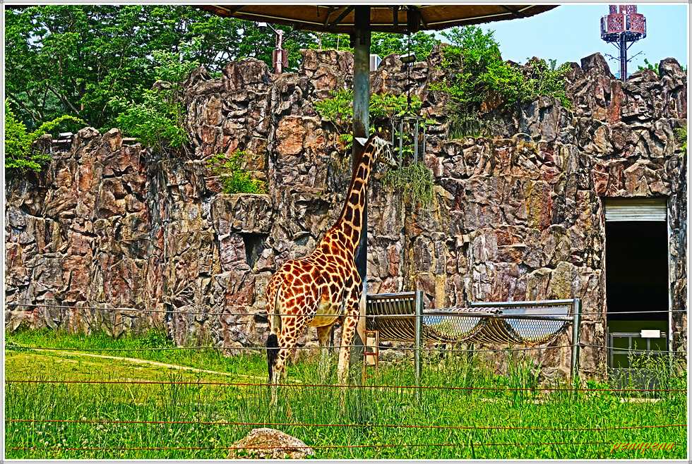 이웃한 곳은 <제1아프리카관>으로 기린이 살고 있습니다. 기린은 포유동물 중에서 키가 가장 큰 동물이어서 보통 5.5m에 달합니다. 몸통은 비교적 짧고 다리와 목이 매우 길며, 등은 궁둥이와 뒷다리를 향해 아래쪽으로 경사져 있습니다. 목이 매우 길지만 목등뼈는 대부분의 포유동물과 마찬가지로 7개라는군요.